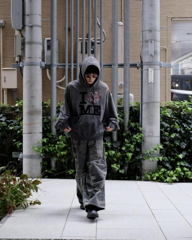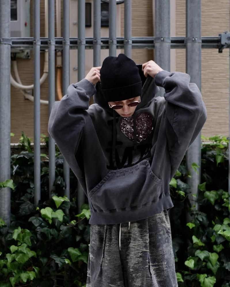 ヴィランの悩みに寄り添ったこのフーディーは、胸のハート部分には形状記憶素材を使用しており、握るとハートが締め付けられた状態で固定され、ヴィランの心の痛みを表現しています。自分自身を守るかのようにアイラブミーと声高に表現してみたり、本当はみんなも自分を愛して欲しいと呟いてみたり。