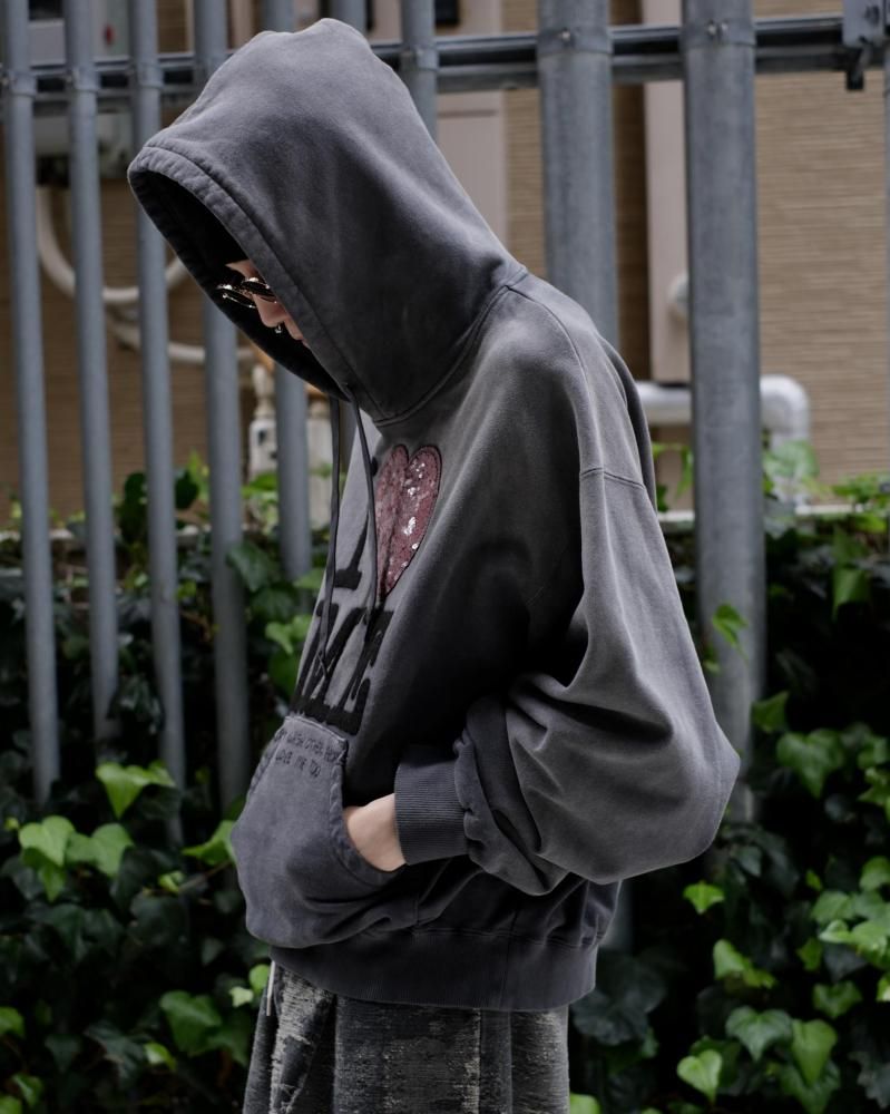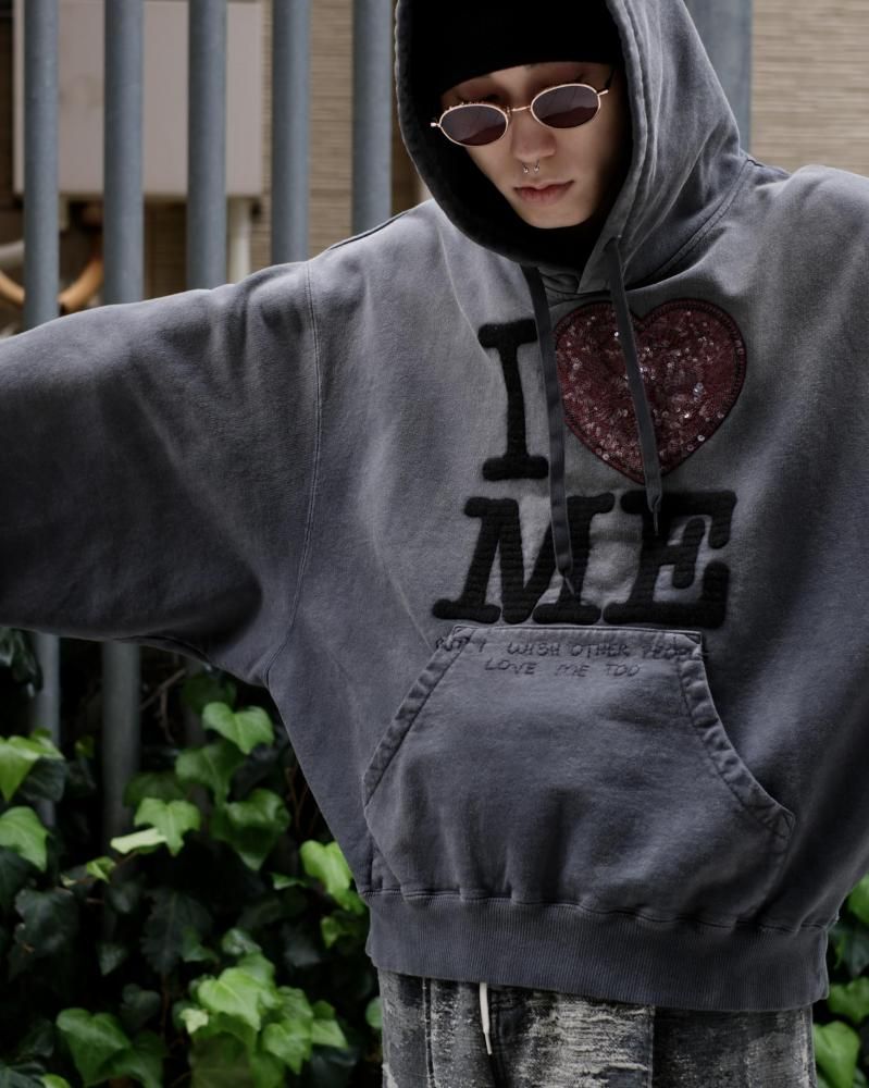 THIS HOODIE, DESIGNED TO EMBODY THE STRUGGLES OF VILLAINS, FEATURES A SHAPE-MEMORY MATERIAL IN THE CHEST'S HEART AREA. WHEN SQUEEZED, THE HEART REMAINS CLENCHED, SYMBOLIZING A VILLAIN'S PAIN. SOMETIMES, THEY SHOUT "I LOVE ME" TO PROTECT THEMSELVES; OTHER TIMES, THEY WHISPER THAT THEY JUST WANT TO BE LOVED.