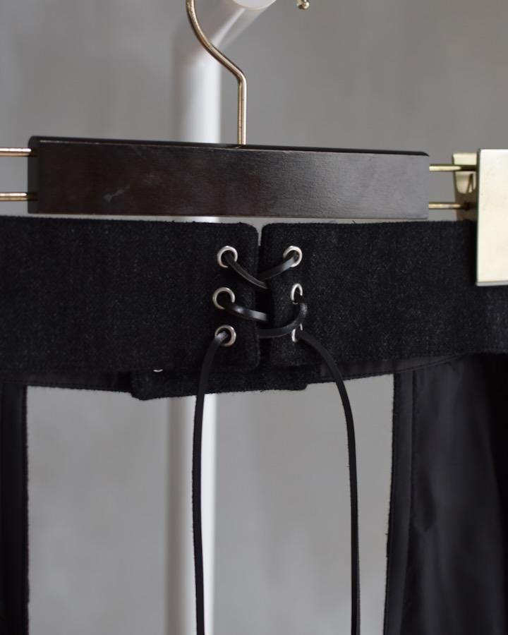 ウェスト後ろの編み上げのレザーレースによってサイズ調整が可能でウェストはフリーサイズとなっている。