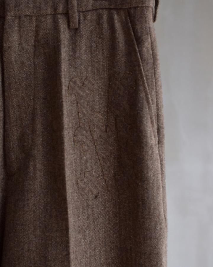 FW24コレクションで発表された、共布のイニシャルワッペンが配されたトラウザーズをベースにしている。