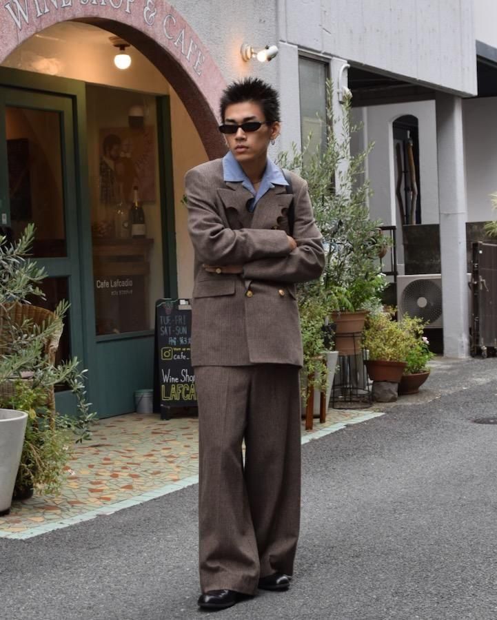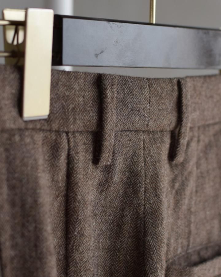 クラシックな印象のヘリンボーン組織のスーツ地を使用。
