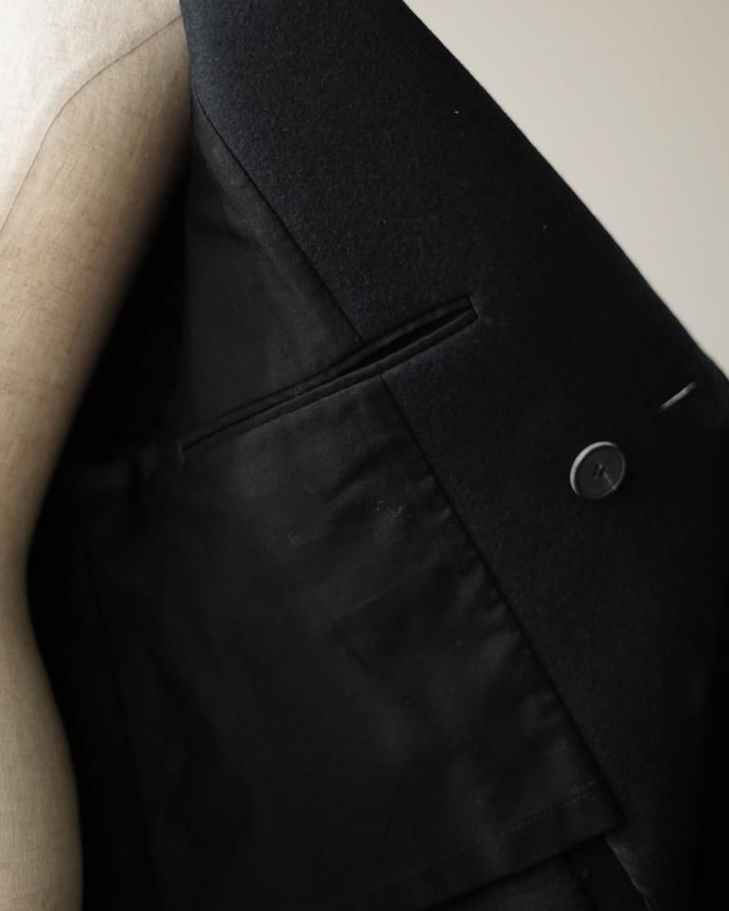カシミヤ同等の細いウール繊維(SUPER 160'S)を、とても薄く二重に織り上げているので、優しい肌触りと、ジャージーのようなソフトでルーズなシルエットが出る、