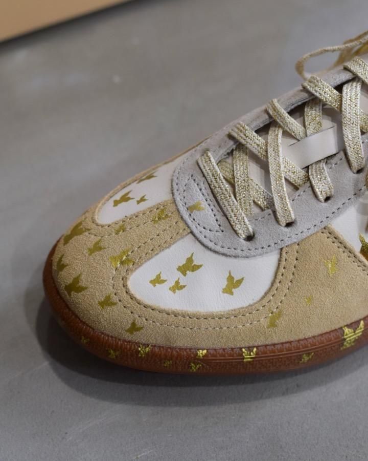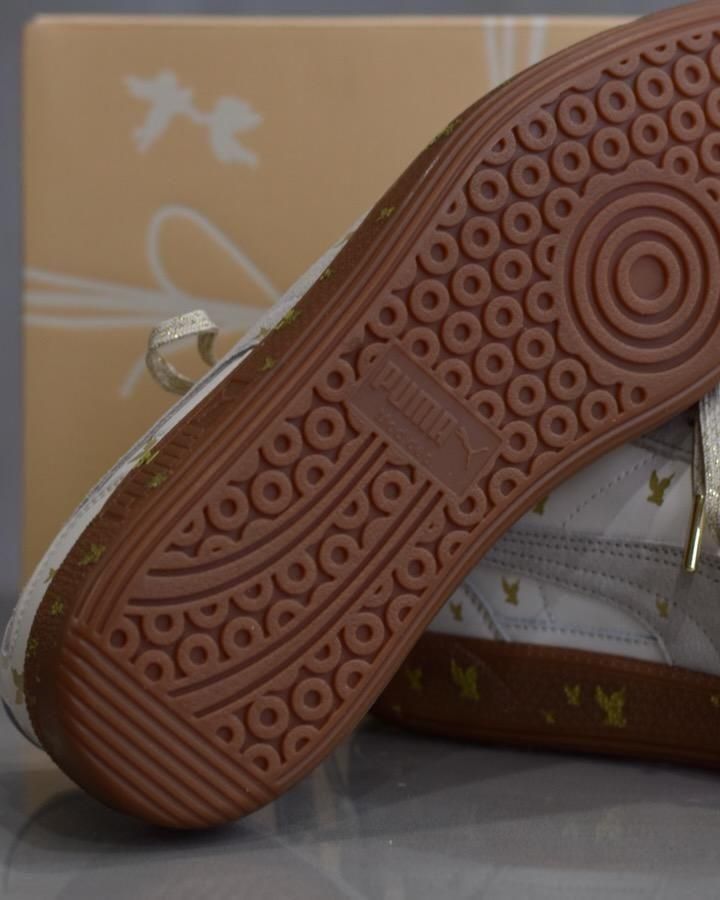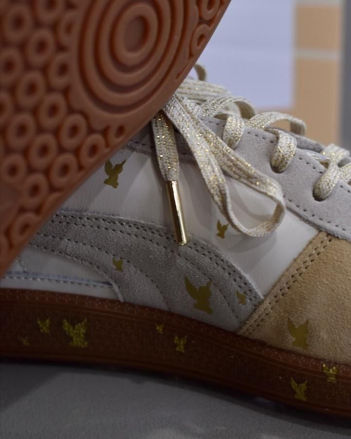 シューレースは繊細なゴールドのラメ糸が編み込まれておりアクセントとなっている。