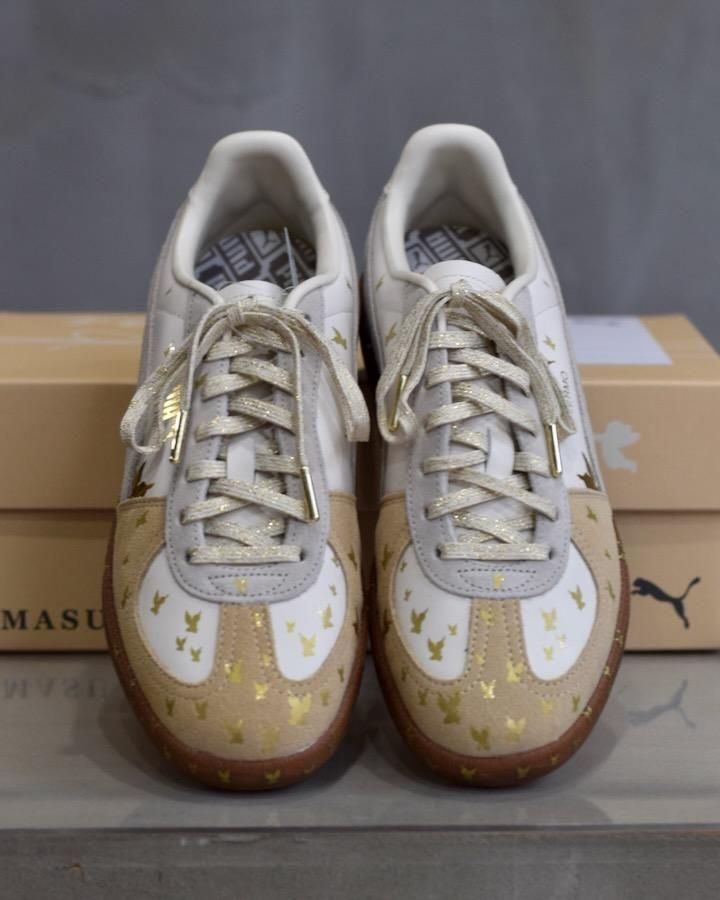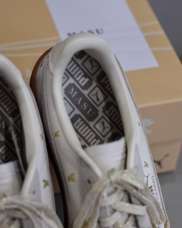 ソールからアッパーまで散りばめられたのは、MASUのアイコンである天使のロゴ。