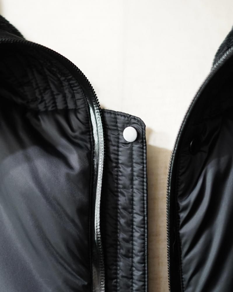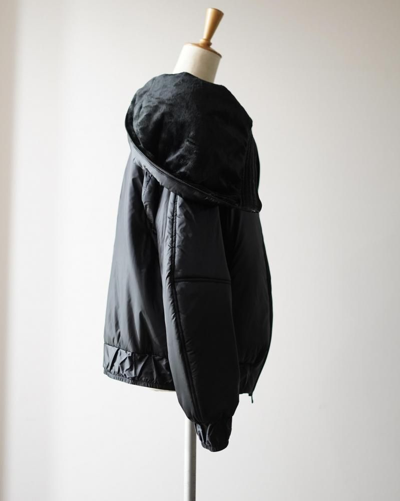 フード裏にはマイクロ糸で編み上げたボアを使用しており、首周りの保温とともに、フライトジャケット然とした強いイメージを表現している。