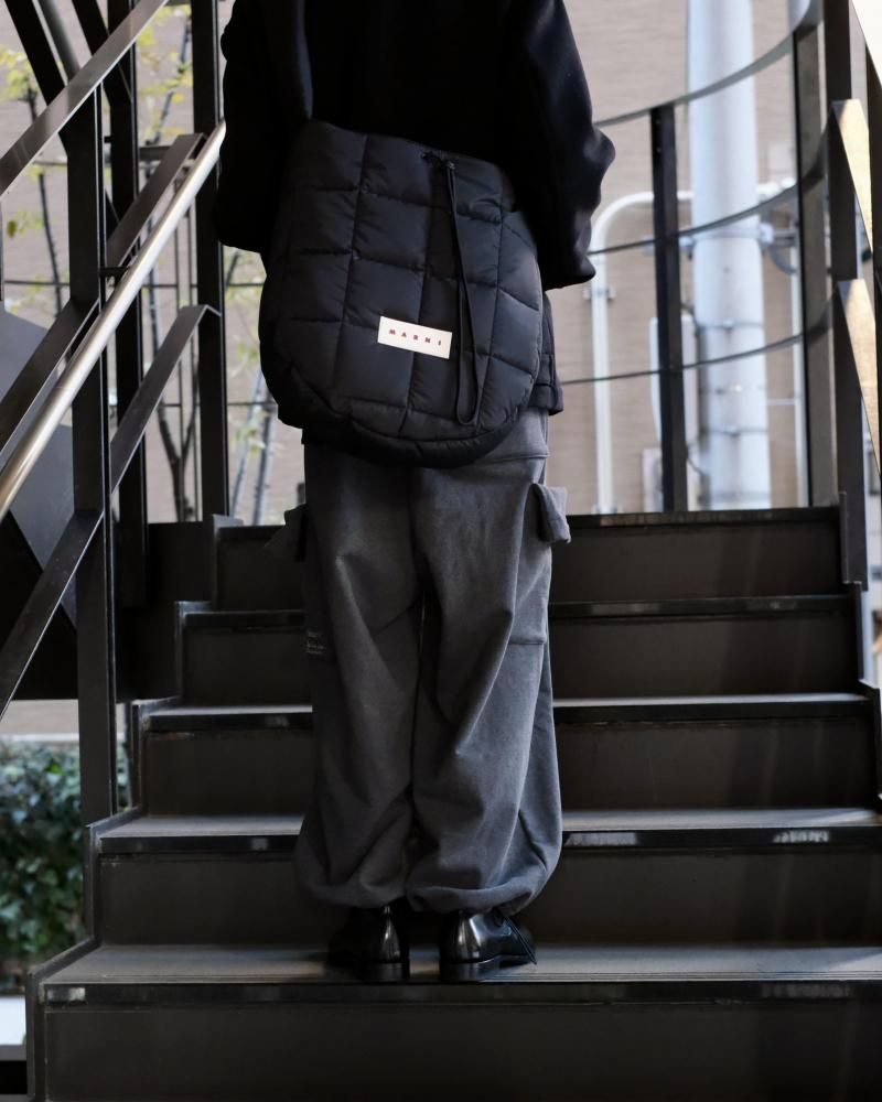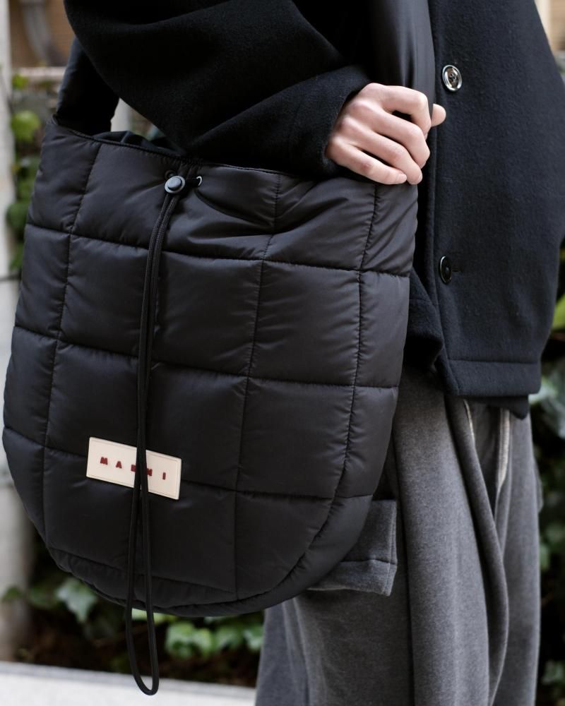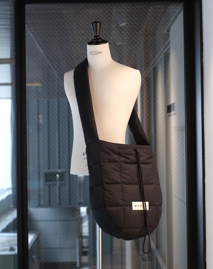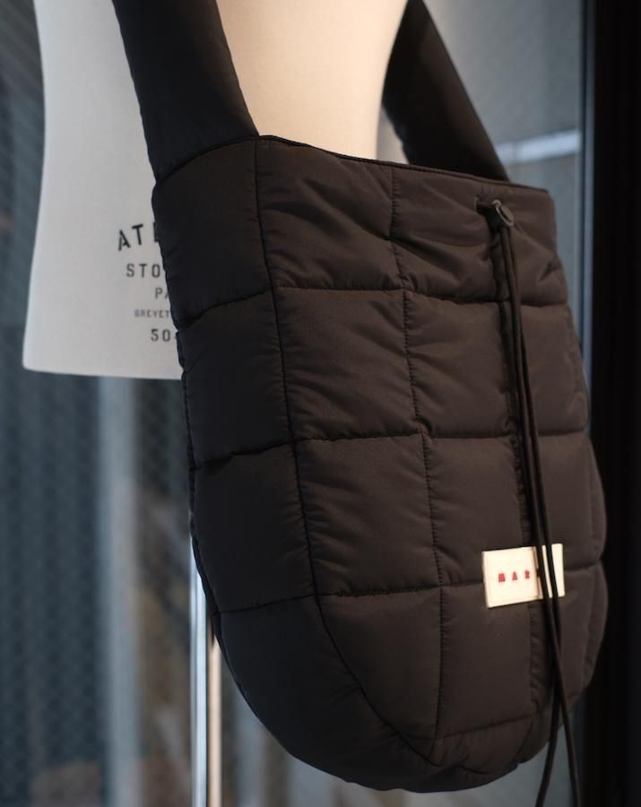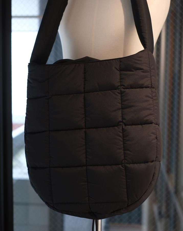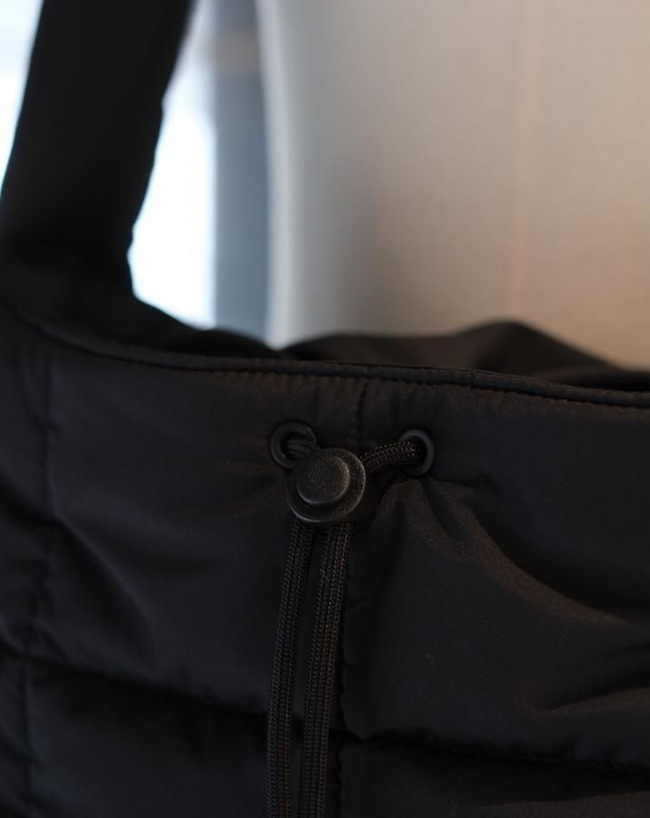 テクニカルファブリックを使用した Puff クロスボディホーボーバッグ。 スクエアキルティングのソフトパッド入りデザイン。 内側にオープンポケット。 トグルストッパー付きドローストリング開閉式。 フロントにラバー製マルニパッチ。