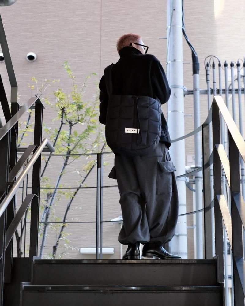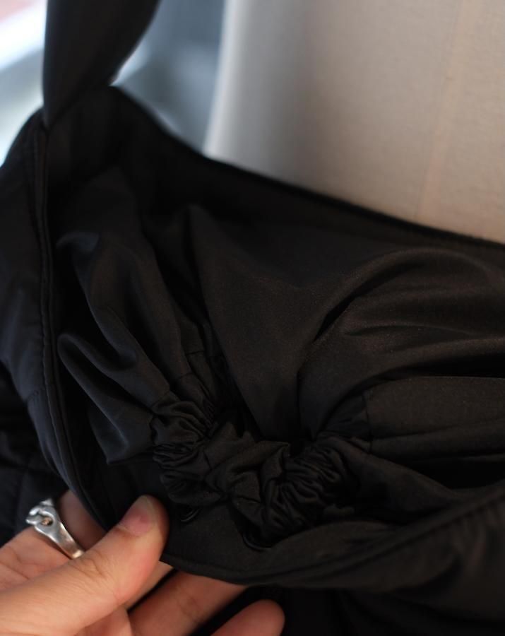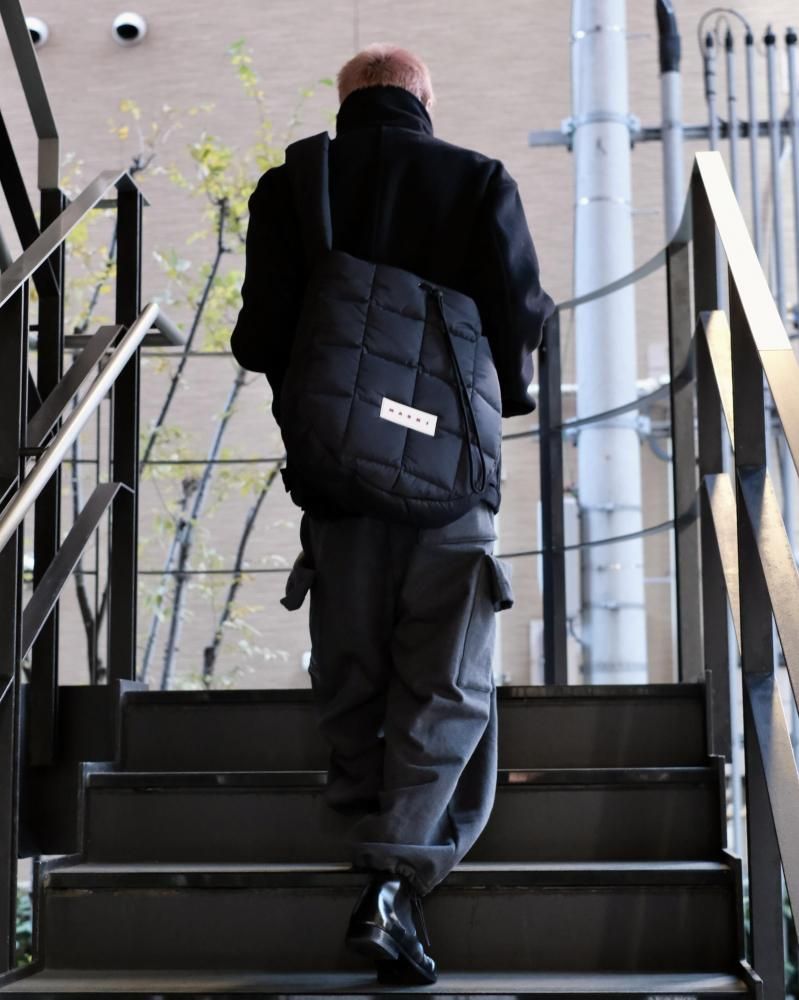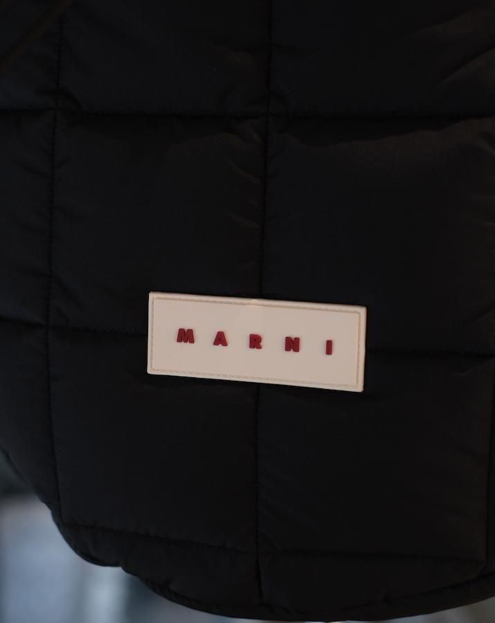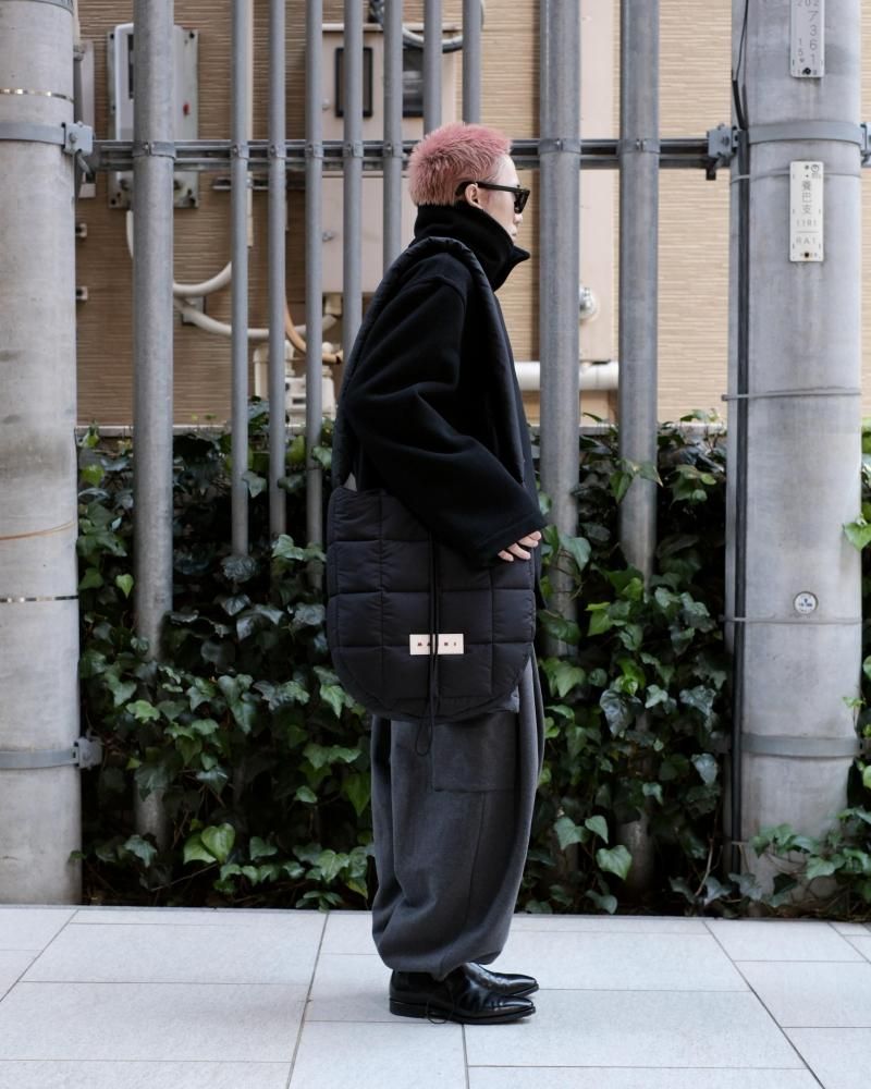 テクニカルファブリックを使用した Puff クロスボディホーボーバッグ。 スクエアキルティングのソフトパッド入りデザイン。 内側にオープンポケット。 トグルストッパー付きドローストリング開閉式。 フロントにラバー製マルニパッチ。