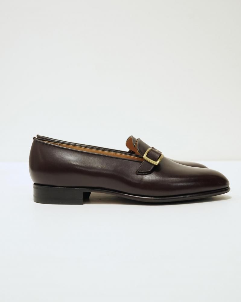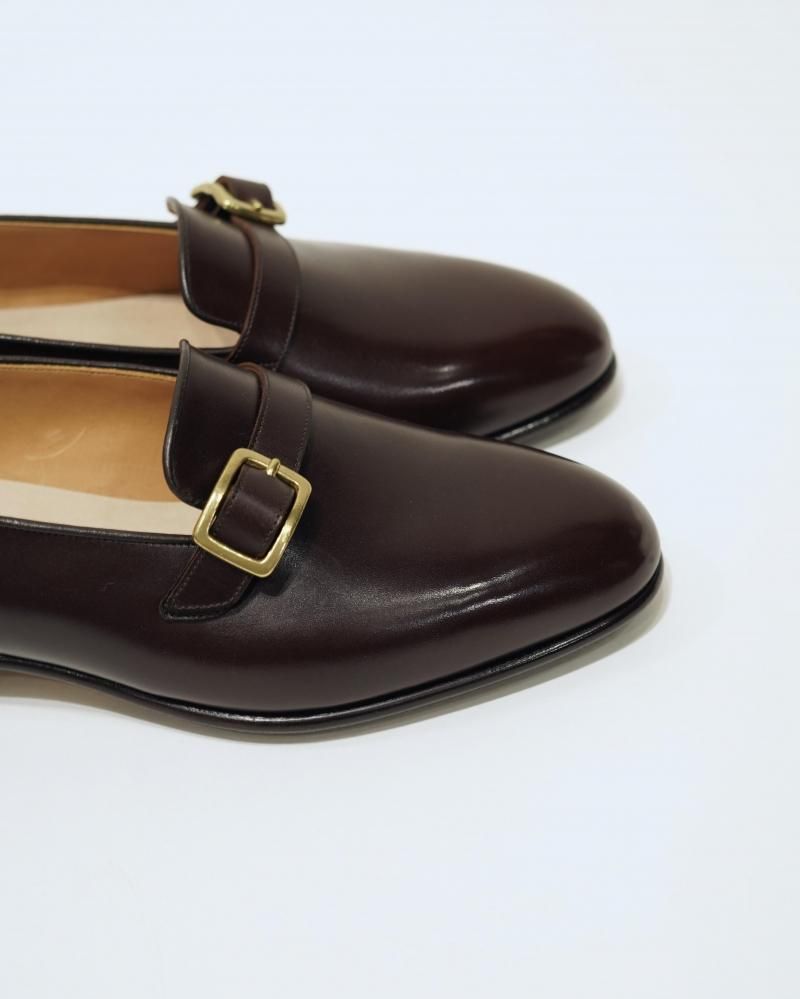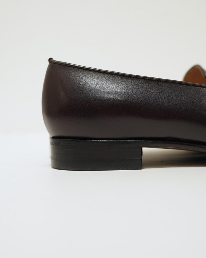 一体型のスリッポンタイプの場合、特にサイドカッティングに負荷が掛かりやすく、その部位をストラップで抑え込む事で後の型崩れを防いでいます。 ストラップは一定の幅では無く、強度を踏まえ剣先とボディに取り付けるボトム部分は太く、甲部分は細くと、全体に抑揚をつけることで機能としての 役割りを果たすために設計された形状を構造美として追及したデザインになります。