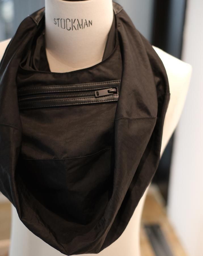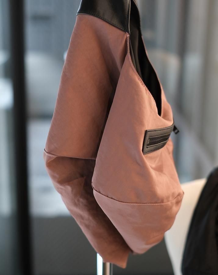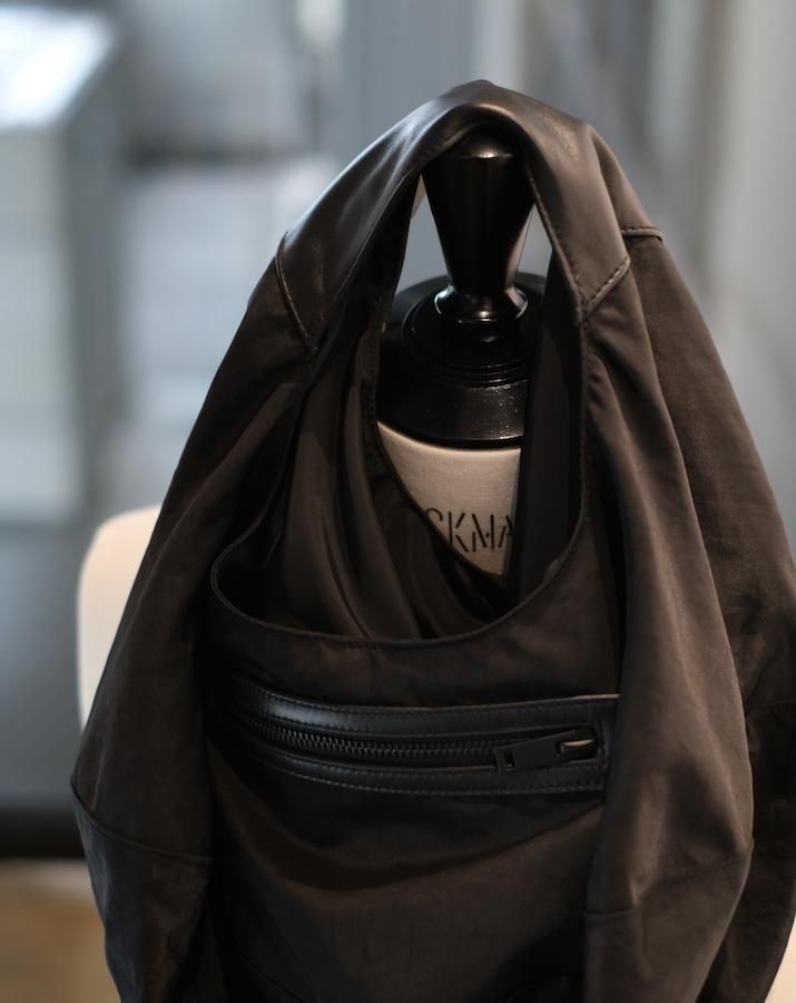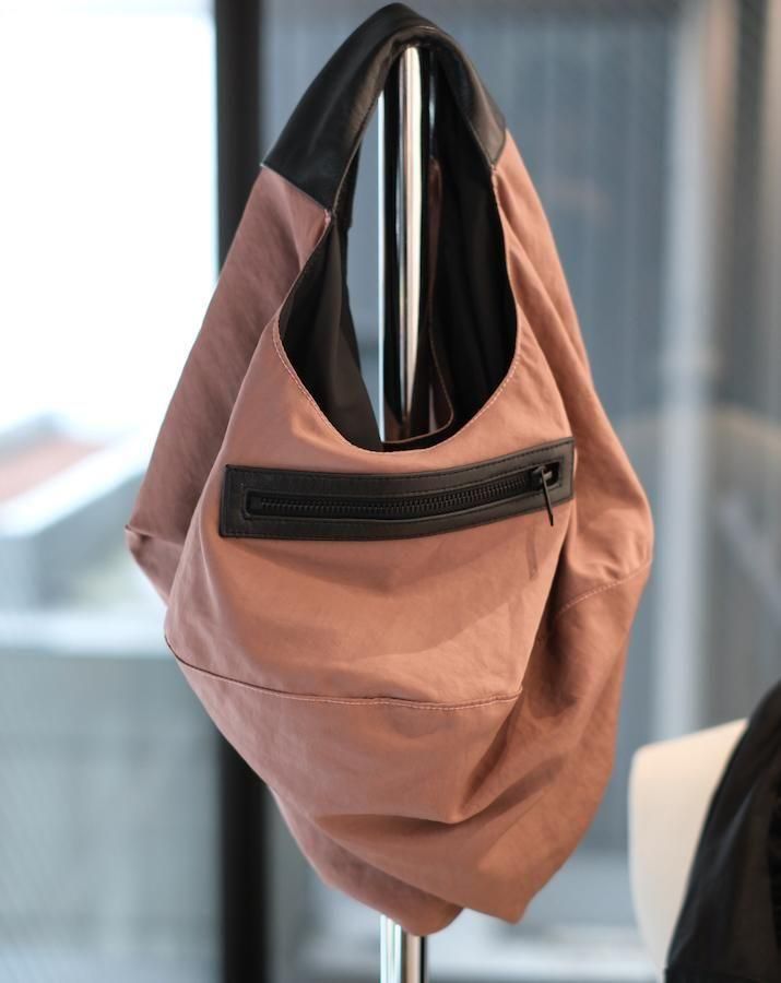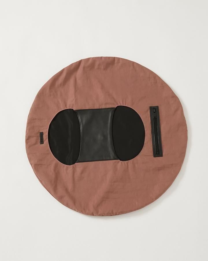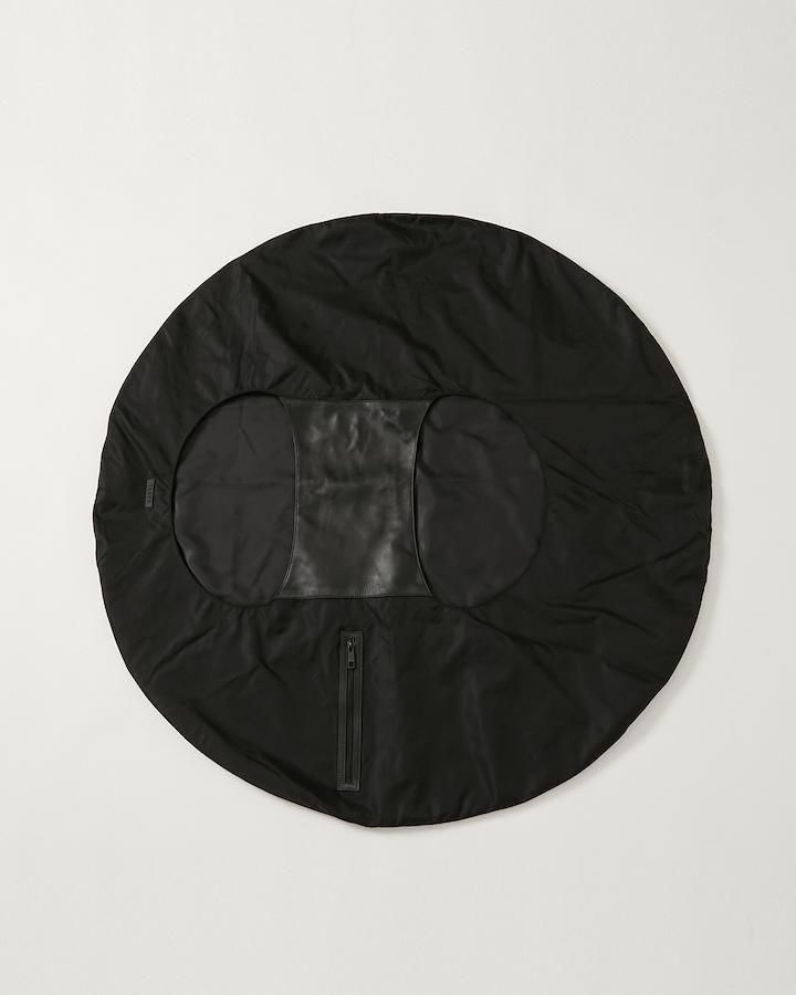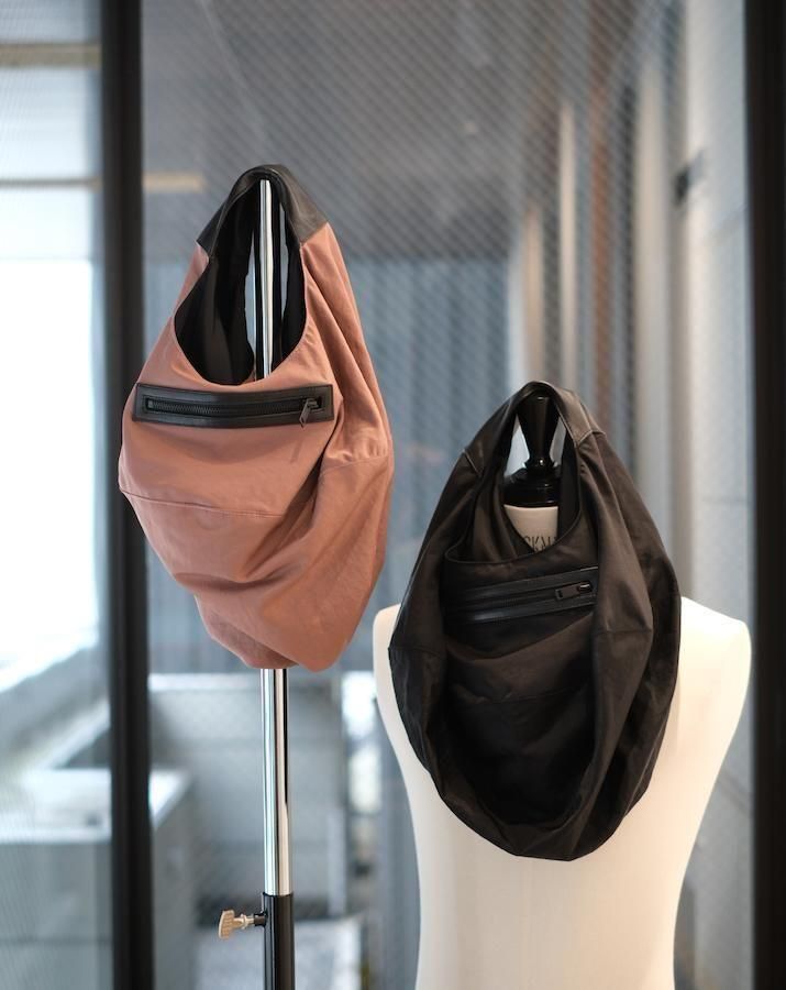 平面の円形から、持ち上げると立体的なバッグに変形するユニークなデザイン。身体に沿って自然にドレープが生まれ、ミニマルな構造ながら彫刻的な存在感を放つ。素材切り替えもポイントで、機能性と視覚的な変化を両立。