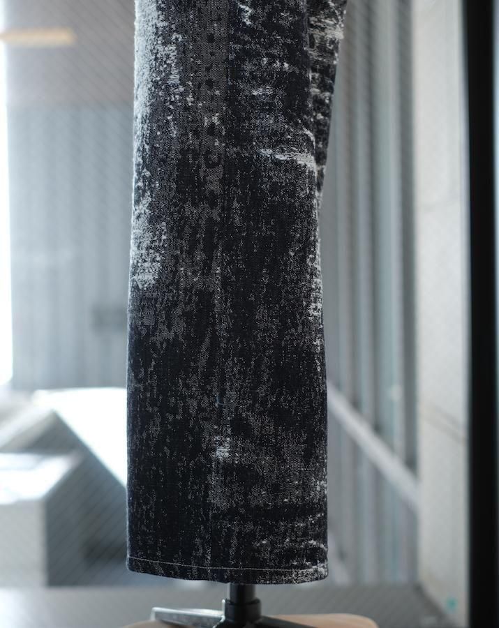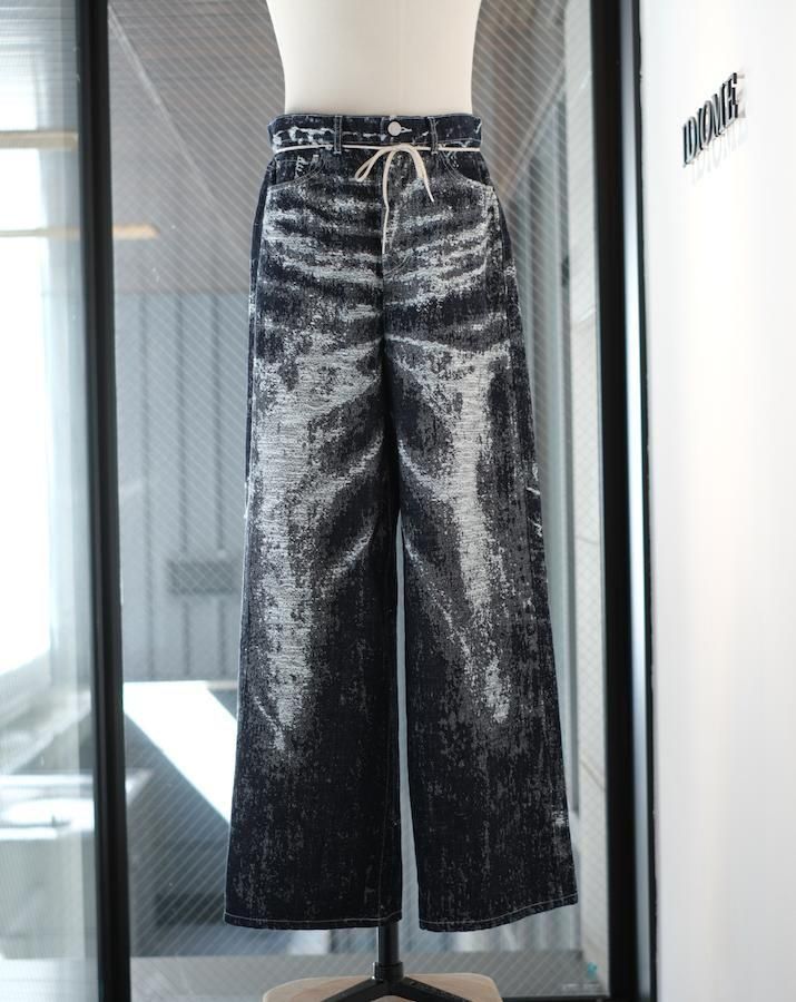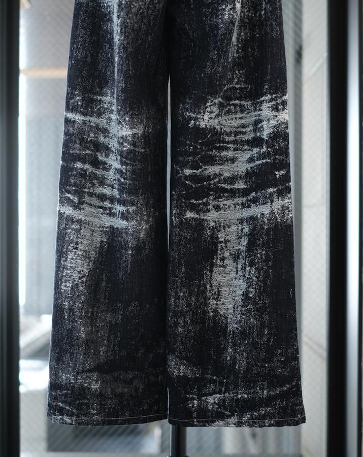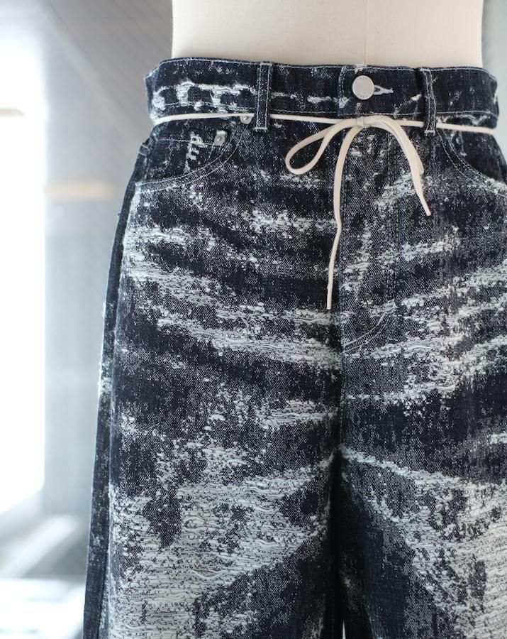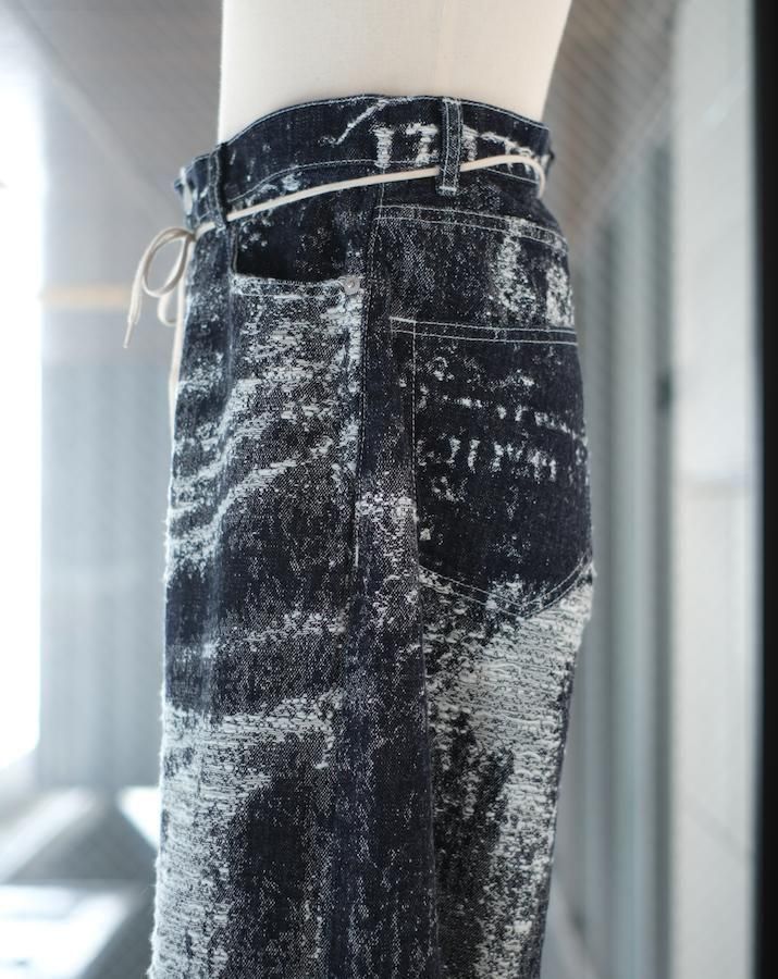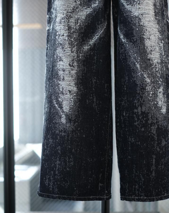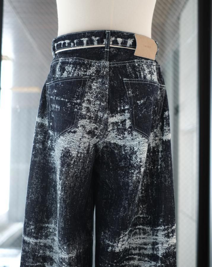 経年変化による色落ちやアタリを、プリントや加工ではなく、ジャカード織りで表現したワイドデニムパンツ。織りの技術で“履き込んだ風景”を描き出す、TAAKKならではのアプローチ。