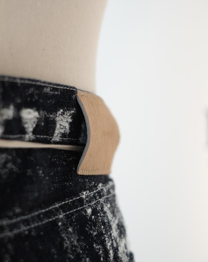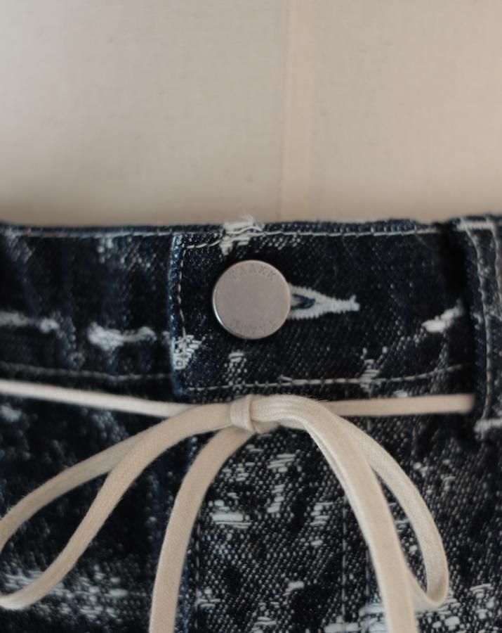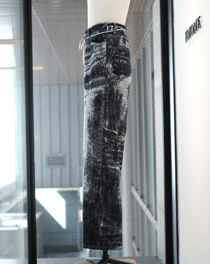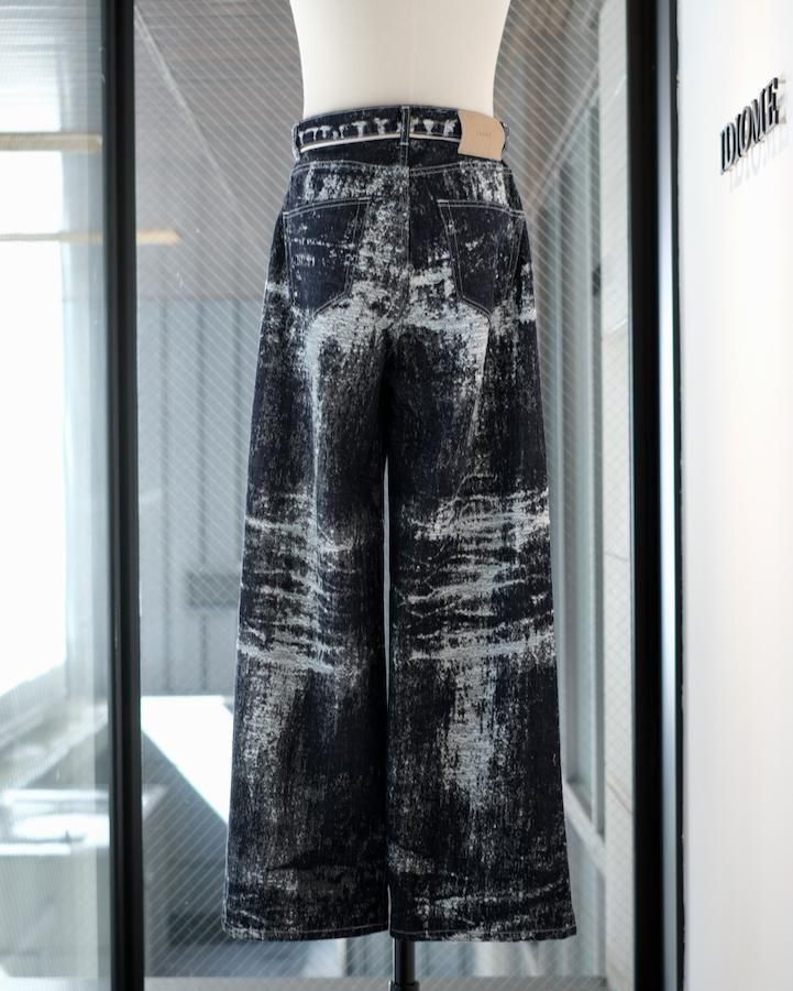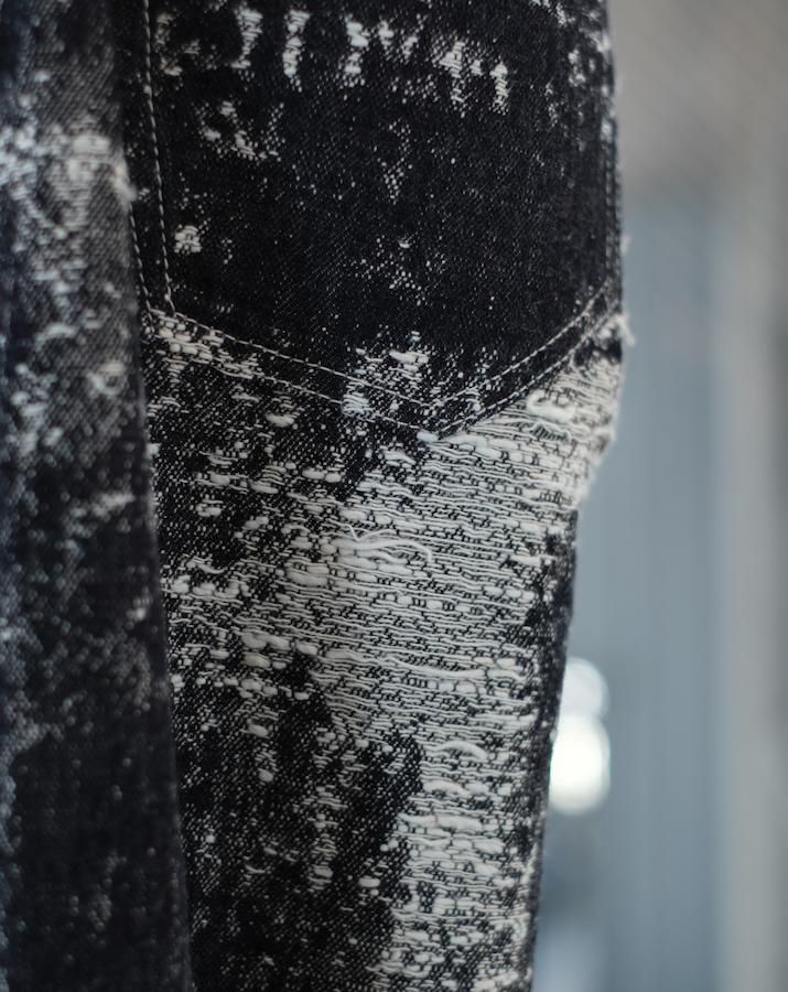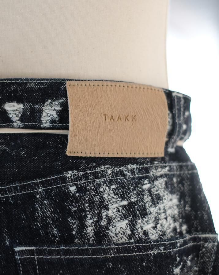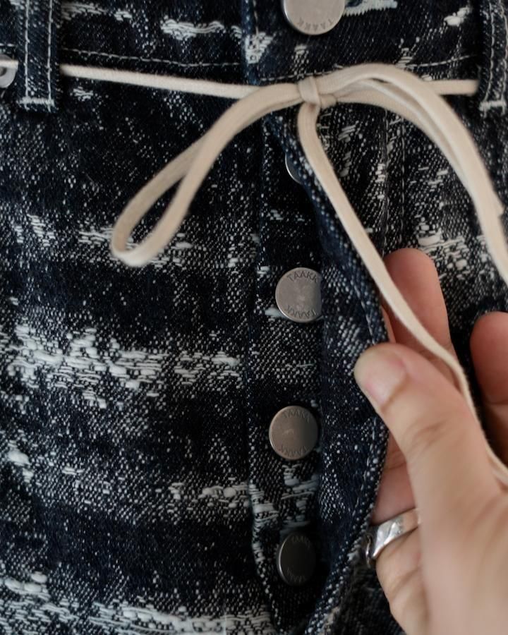経年変化による色落ちやアタリを、プリントや加工ではなく、ジャカード織りで表現したワイドデニムパンツ。織りの技術で“履き込んだ風景”を描き出す、TAAKKならではのアプローチ。