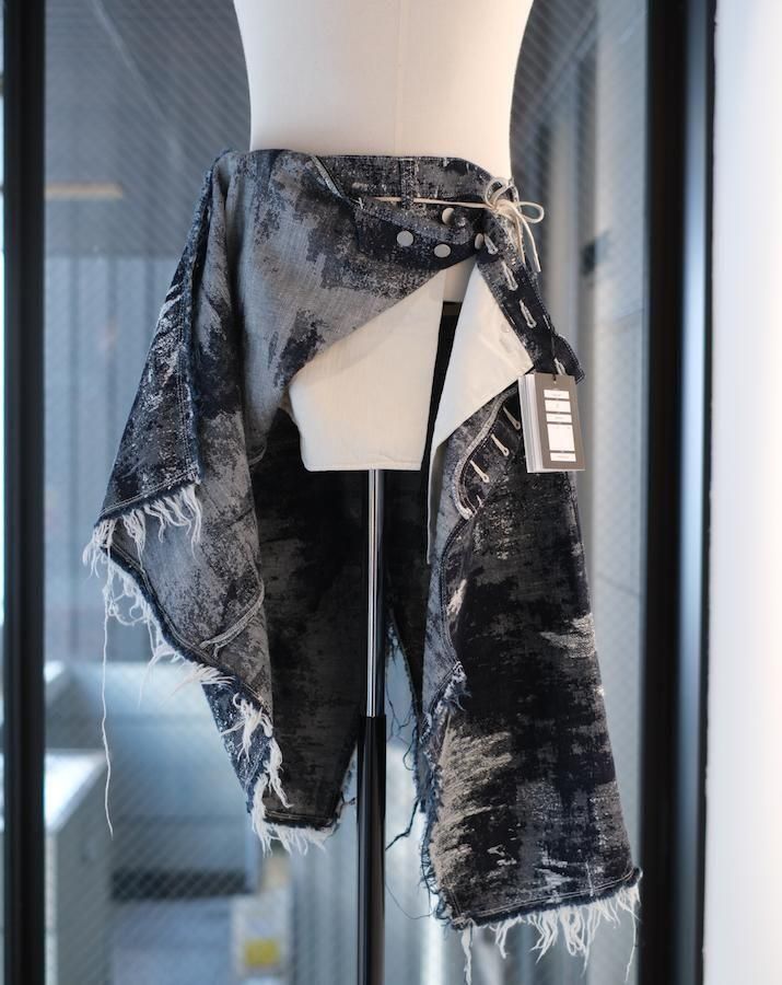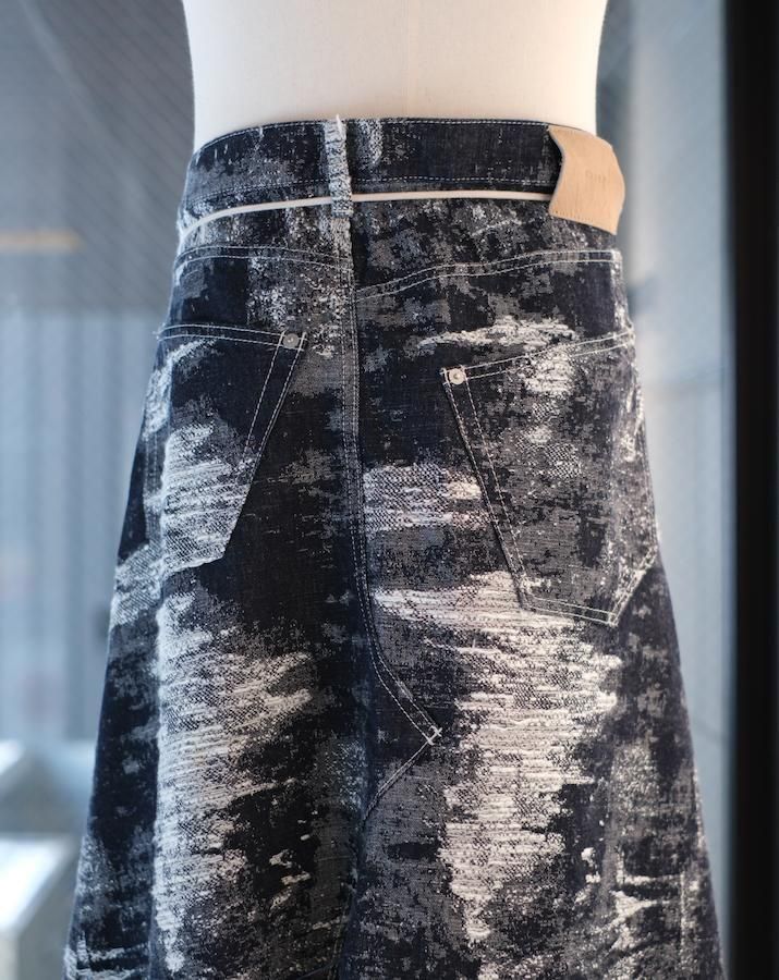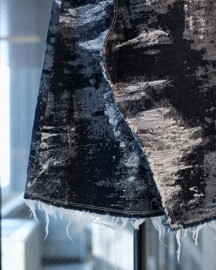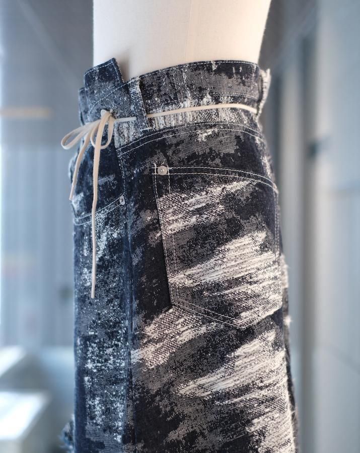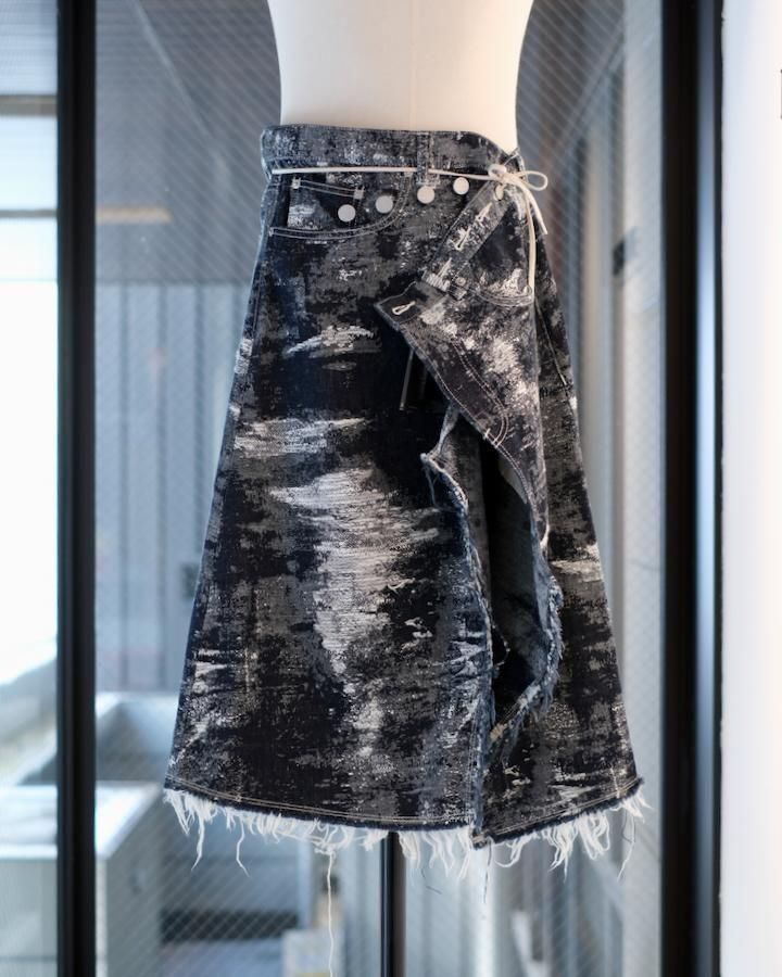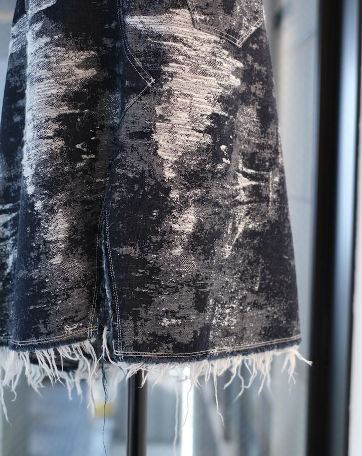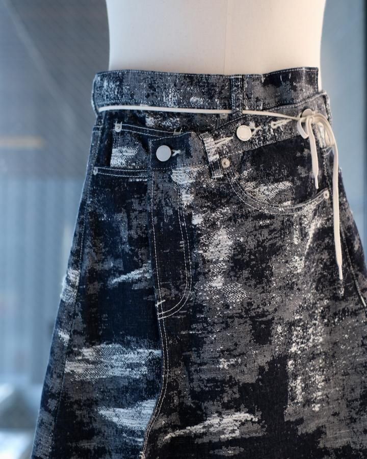 TAAKK定番のデニムシリーズから、新たに登場したラップスカート。表情豊かな生地は、ネップ糸を織り交ぜてジャカード織で仕立てたTAAKKデニム。表面に現れる不規則な凸凹とムラ感が、ラフでありながらもどこか彫刻的な存在感のある生地。大胆に重なり合うフロントのラップ構造と、裾の断ち切りによるフリンジ処理がエレガンスと野性の同居を表現。