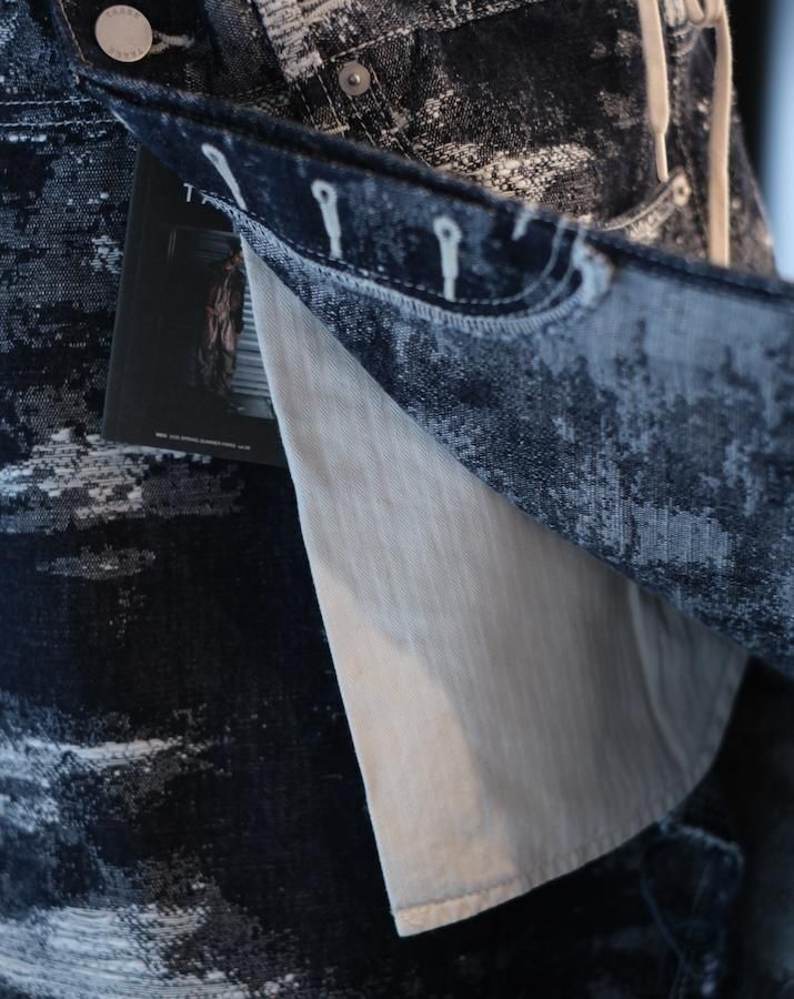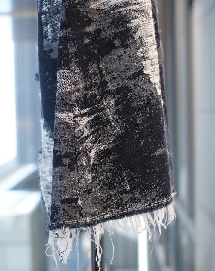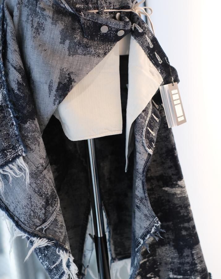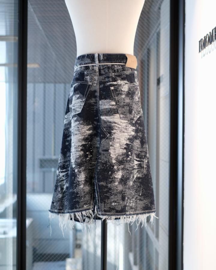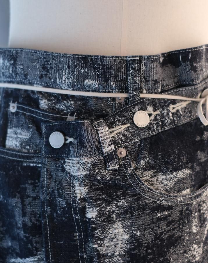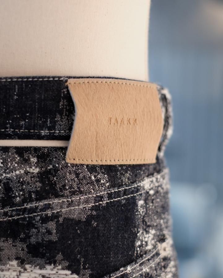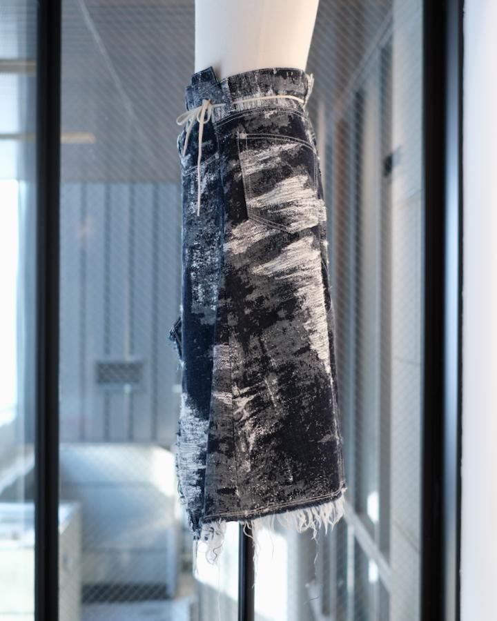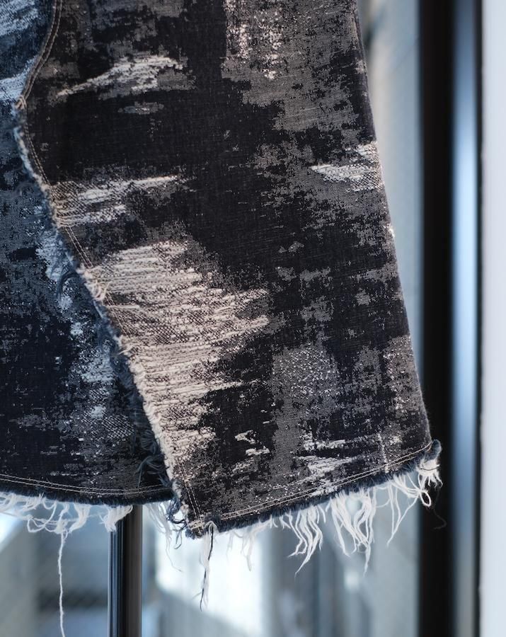 TAAKK定番のデニムシリーズから、新たに登場したラップスカート。表情豊かな生地は、ネップ糸を織り交ぜてジャカード織で仕立てたTAAKKデニム。表面に現れる不規則な凸凹とムラ感が、ラフでありながらもどこか彫刻的な存在感のある生地。大胆に重なり合うフロントのラップ構造と、裾の断ち切りによるフリンジ処理がエレガンスと野性の同居を表現。