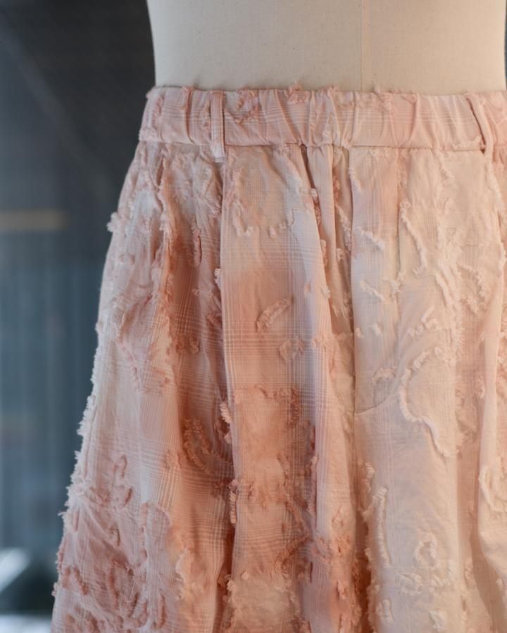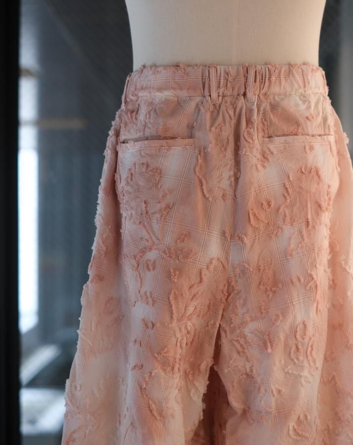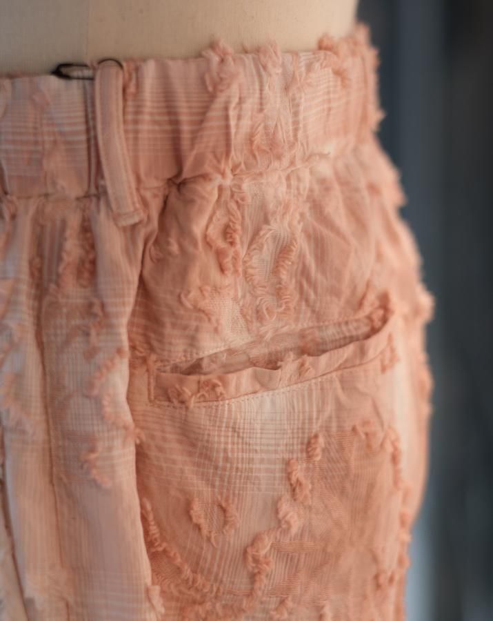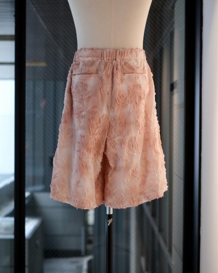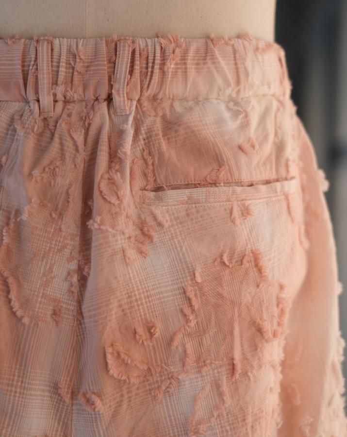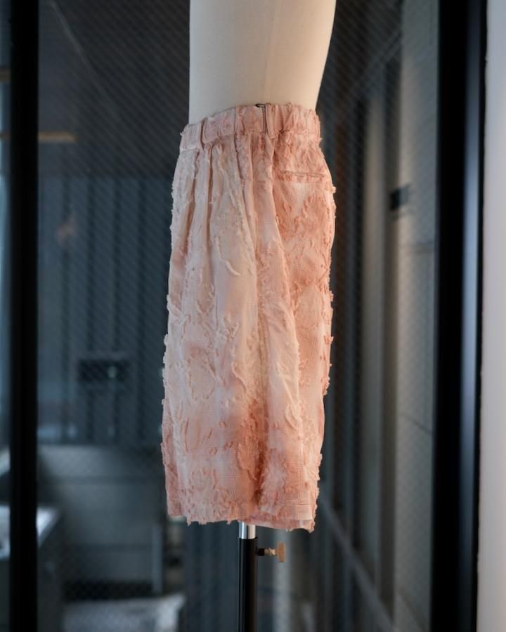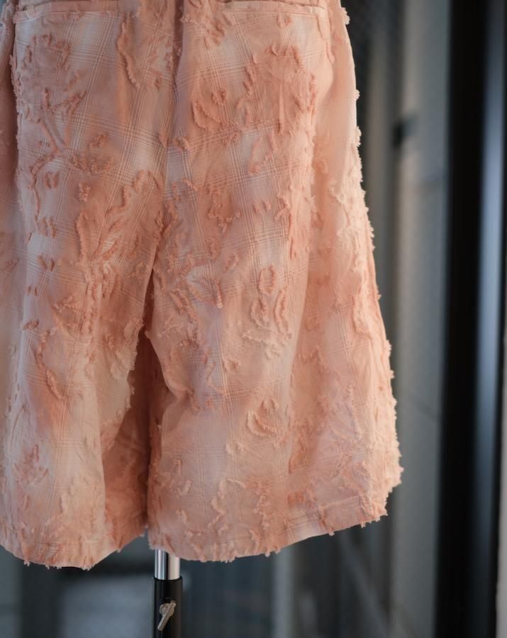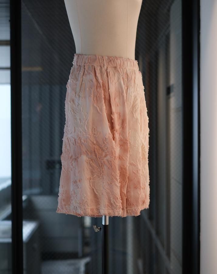 綿とアセテートの染色差によって浮かび上がるシャドーチェックに、カットジャガードで立体的な表情を加えた生地。縫製後、京都の染め職人の手により綿の部分だけが染まるようにムラ染めを施し、視覚と質感が交差するショートパンツ。