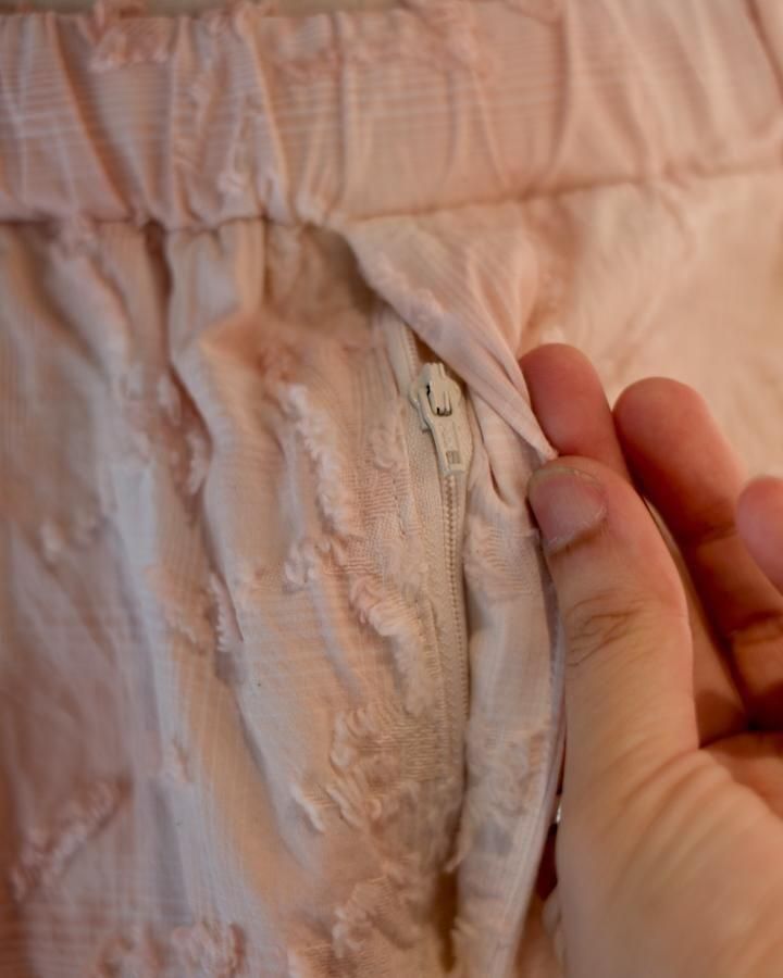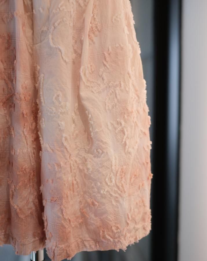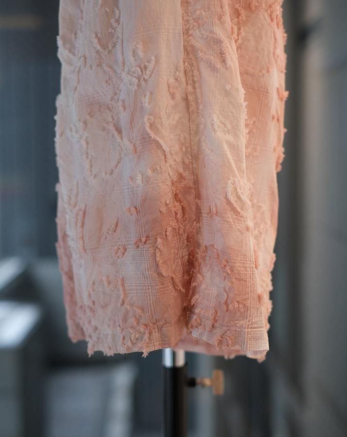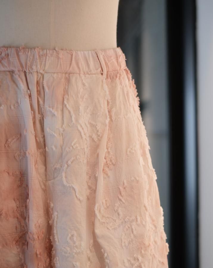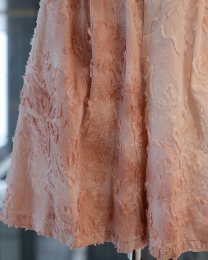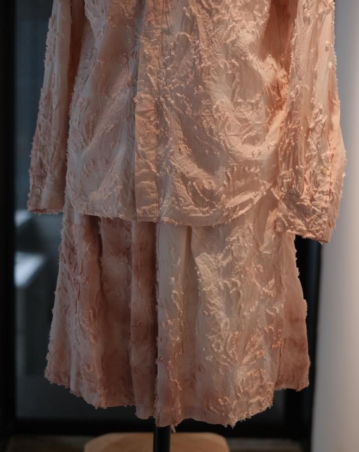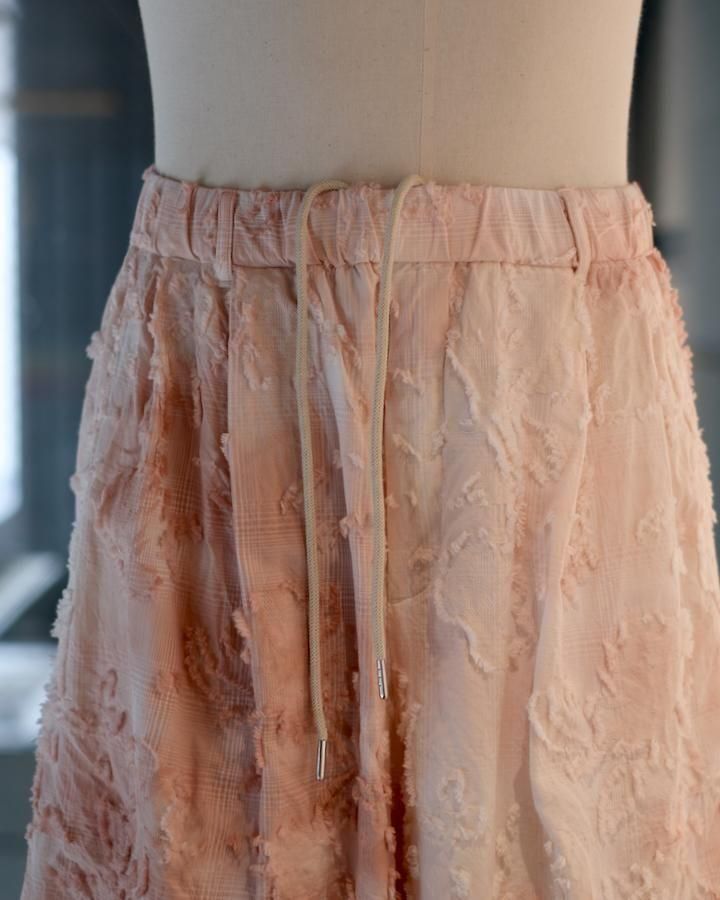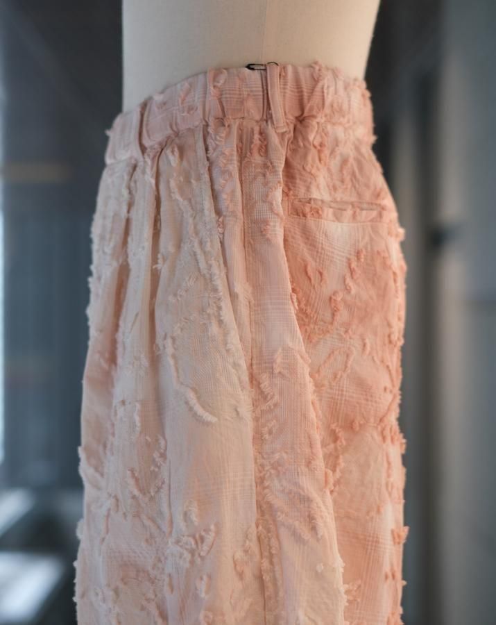 綿とアセテートの染色差によって浮かび上がるシャドーチェックに、カットジャガードで立体的な表情を加えた生地。縫製後、京都の染め職人の手により綿の部分だけが染まるようにムラ染めを施し、視覚と質感が交差するショートパンツ。