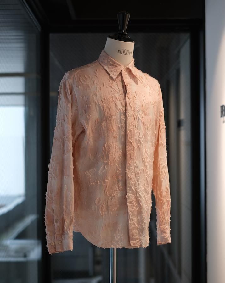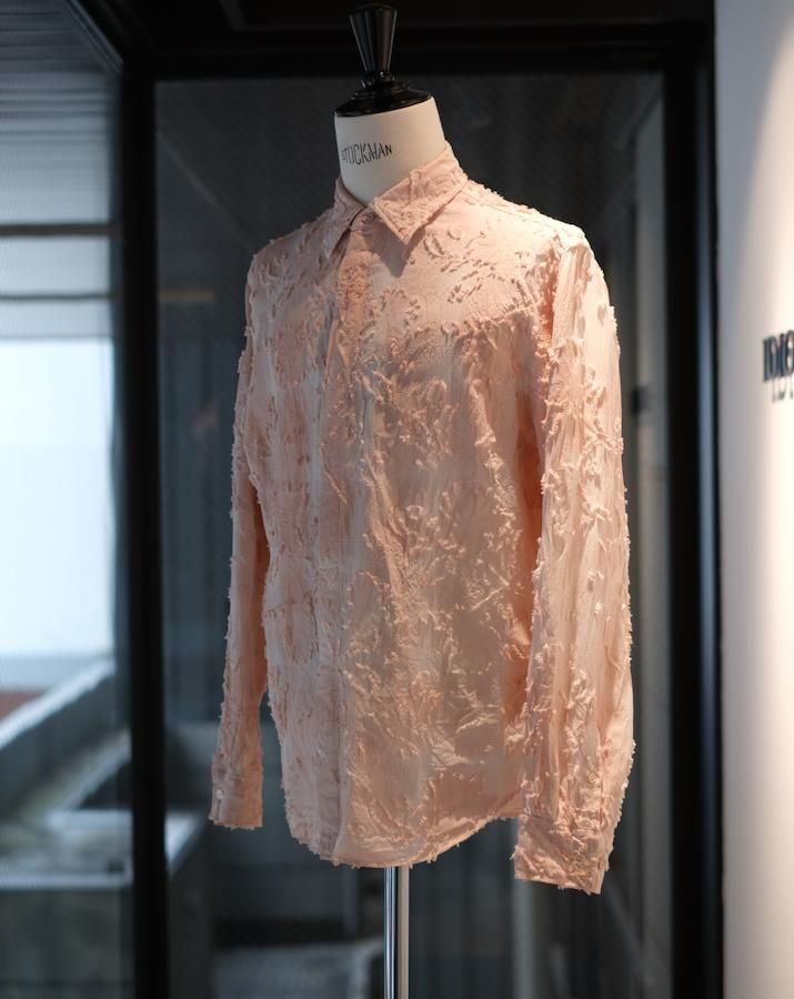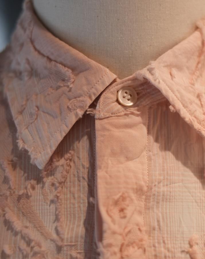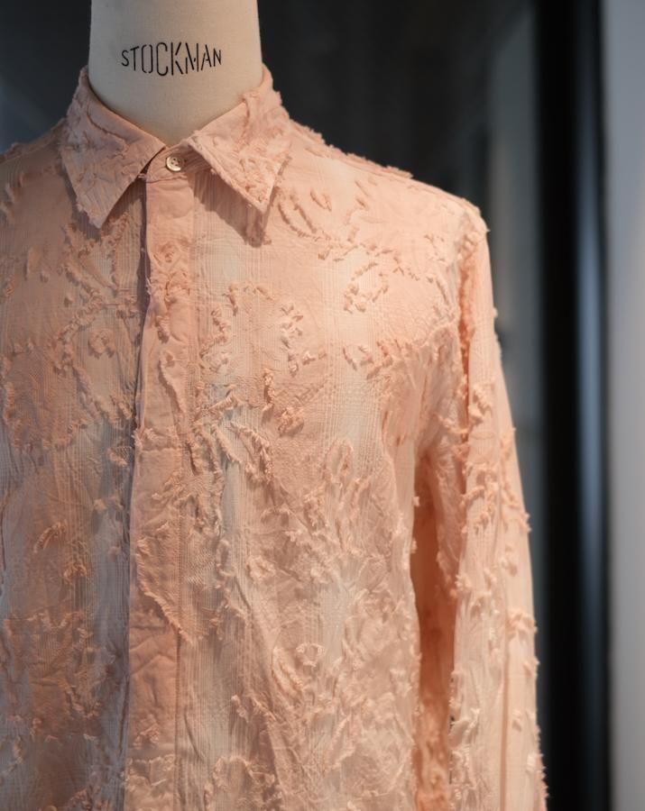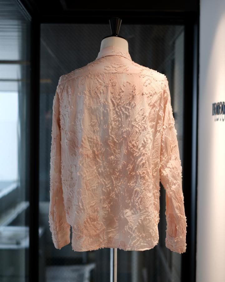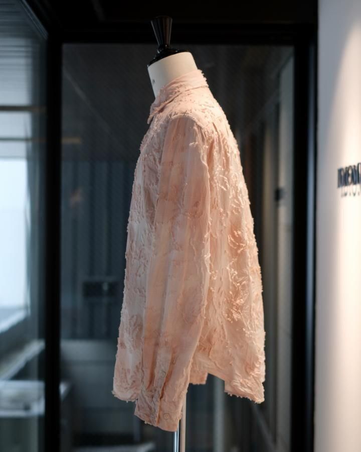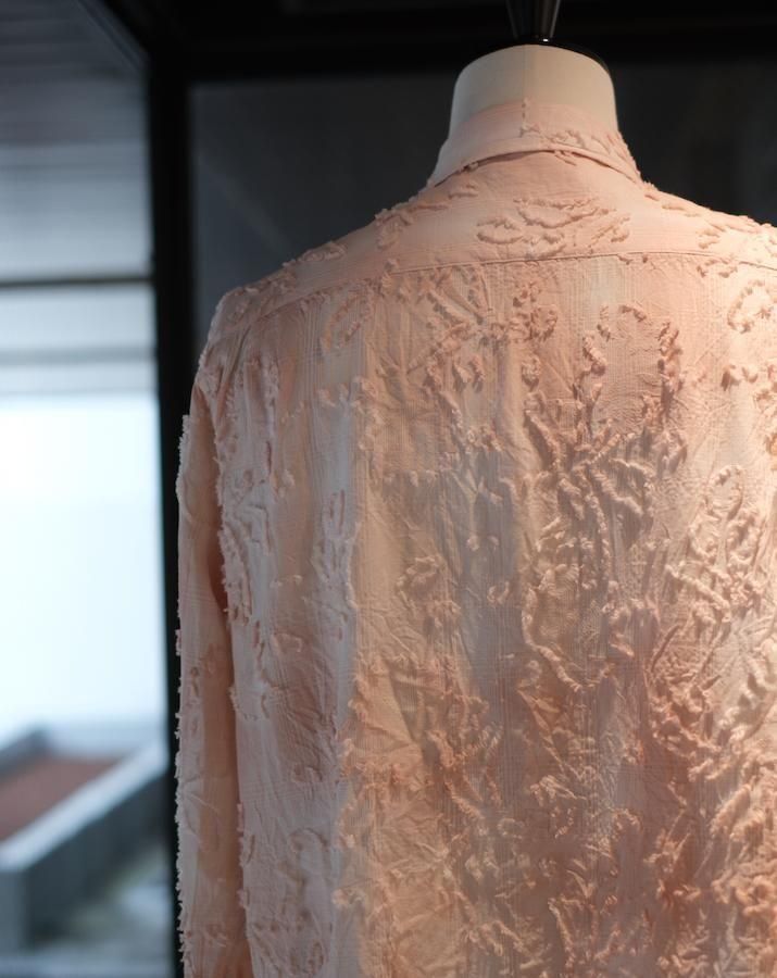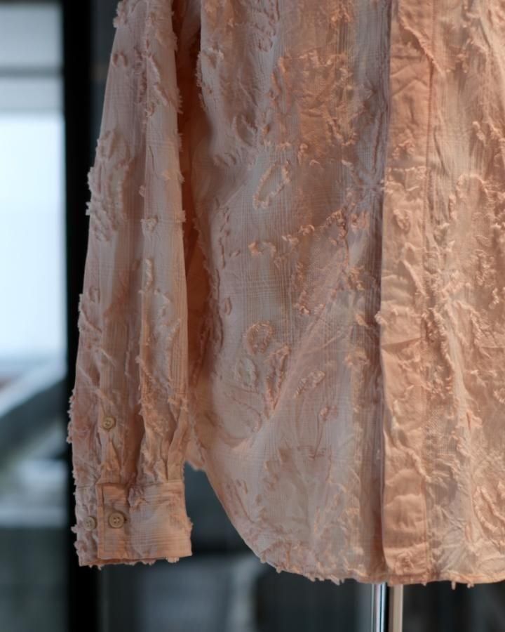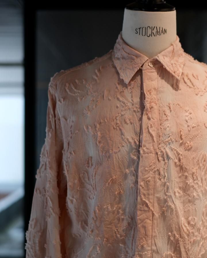綿とアセテートの染色差によって浮かび上がるシャドーチェックに、カットジャガードで立体的な表情を加えた生地。縫製後、京都の染め職人の手により綿の部分だけが染まるようにムラ染めを施し、視覚と質感が交差するレギュラーフィットシャツ。