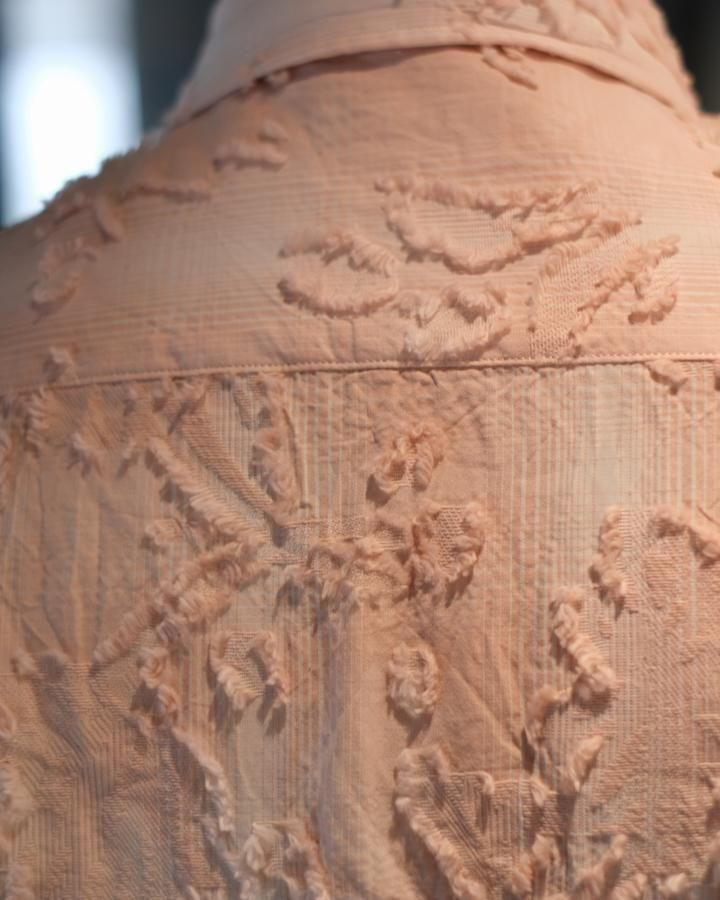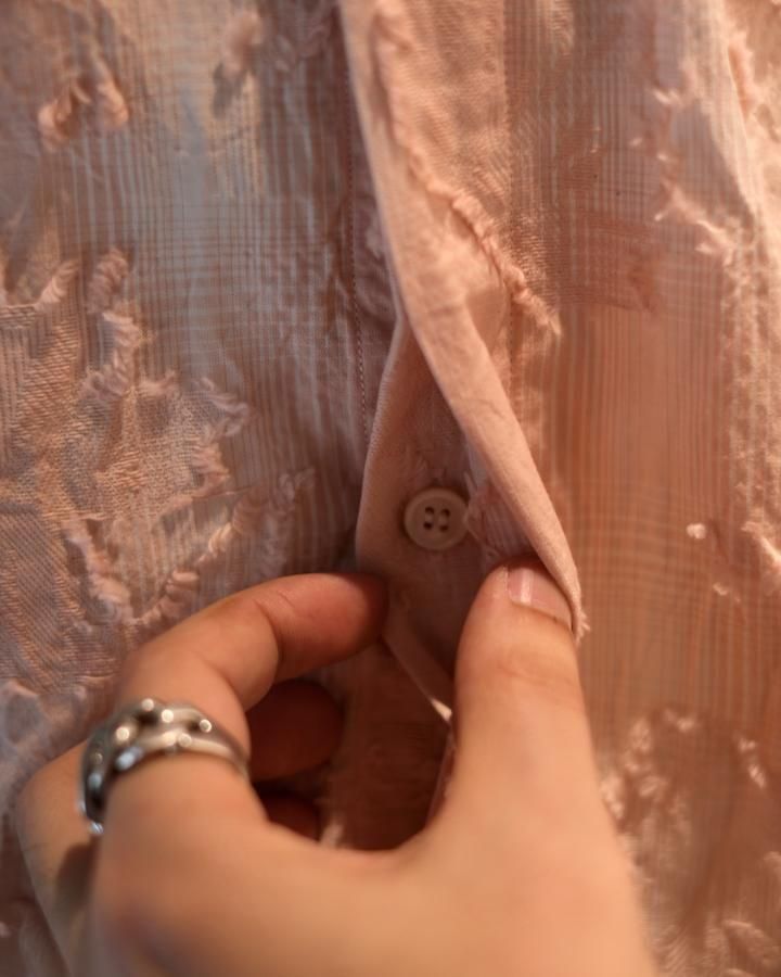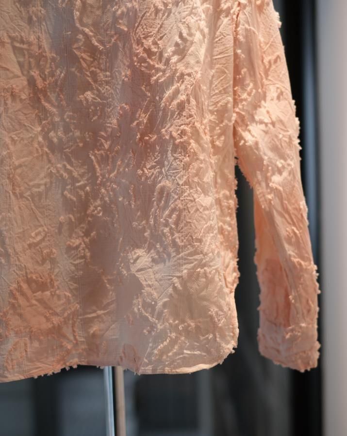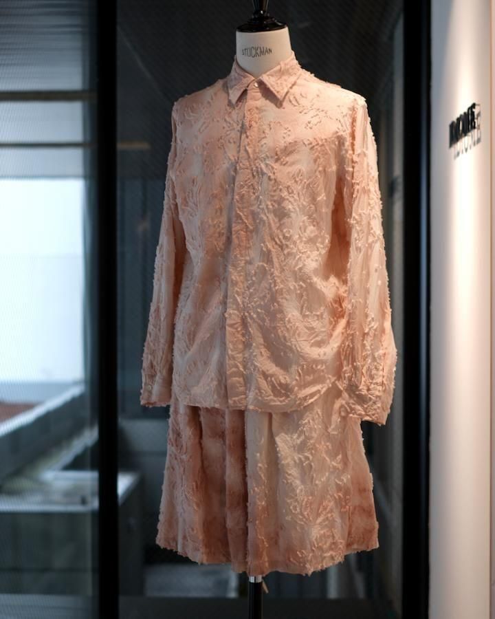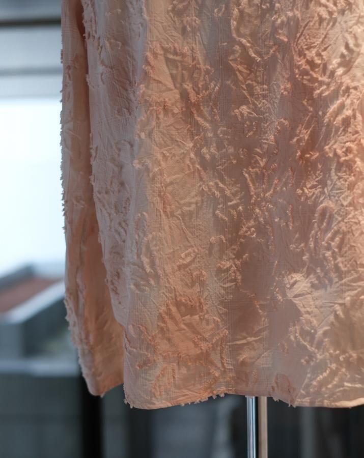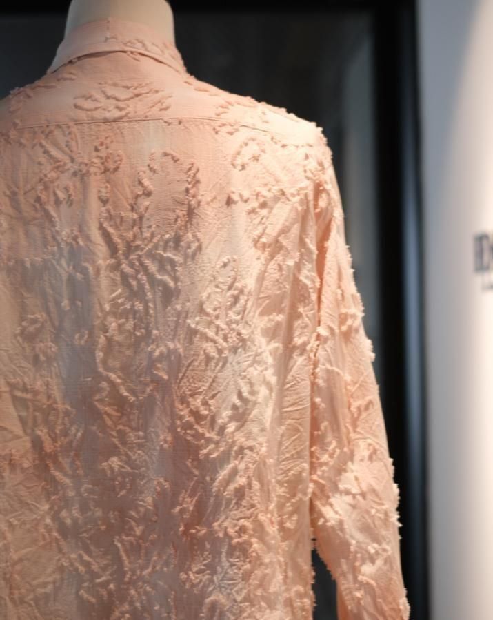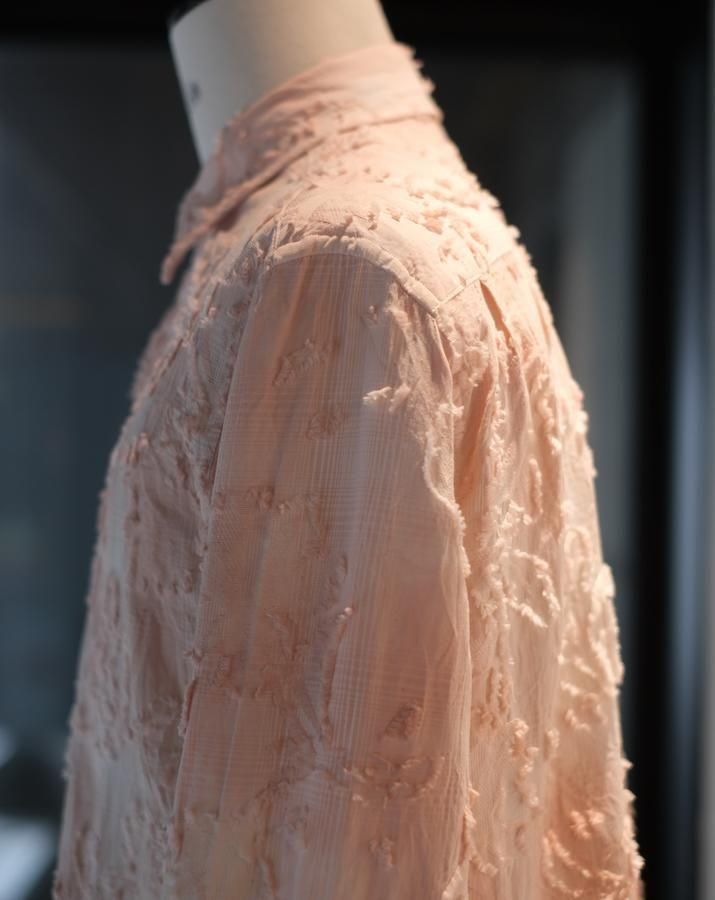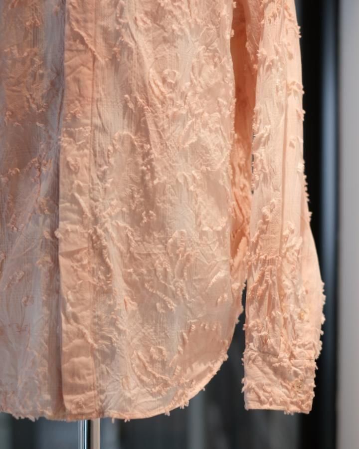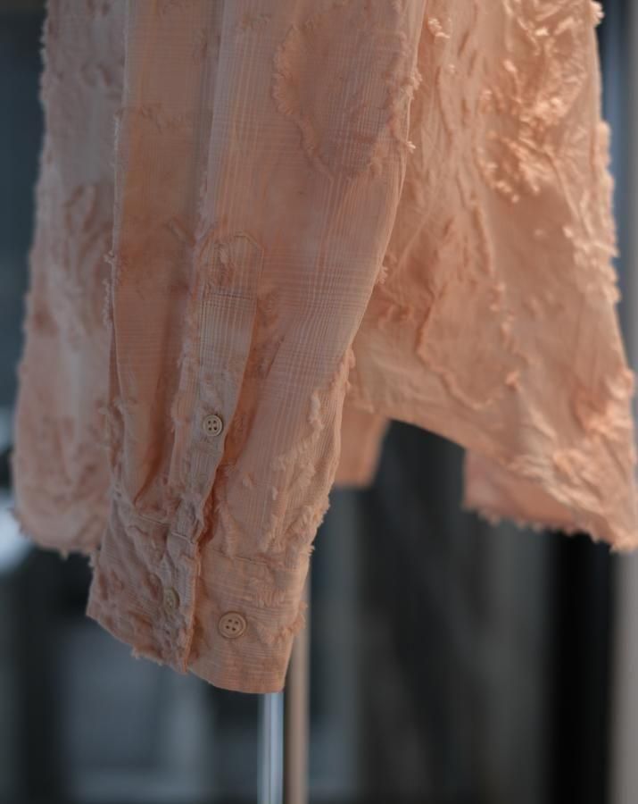 綿とアセテートの染色差によって浮かび上がるシャドーチェックに、カットジャガードで立体的な表情を加えた生地。縫製後、京都の染め職人の手により綿の部分だけが染まるようにムラ染めを施し、視覚と質感が交差するレギュラーフィットシャツ。